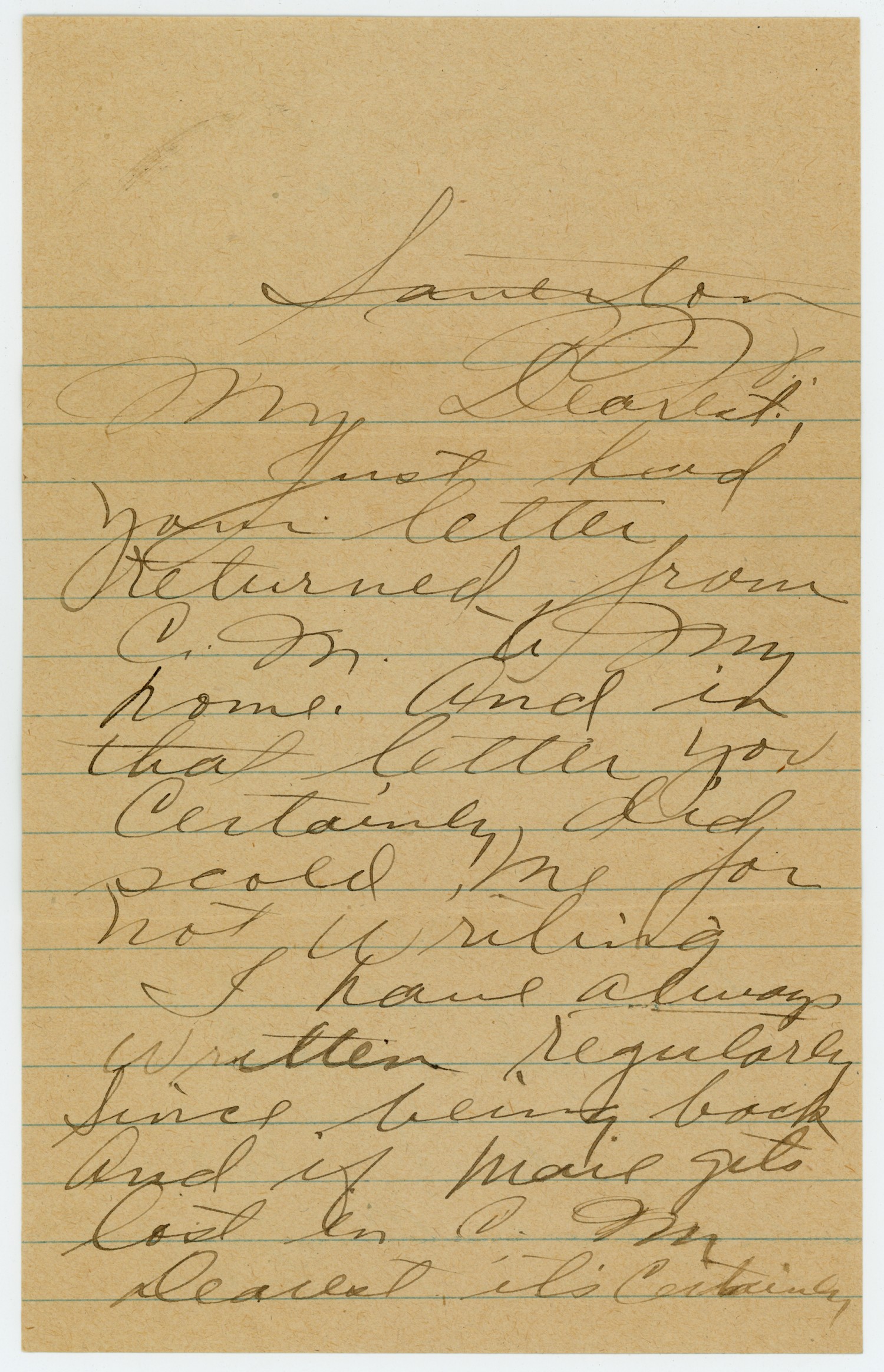 [ms illegible: 1 wd] My Dearest: Just had your letter returned from C.M. to my home. And in that letter you Certainly did scold me for not writing I have always written regularly since being back and if Marie gets lost in C.M. Dearest it