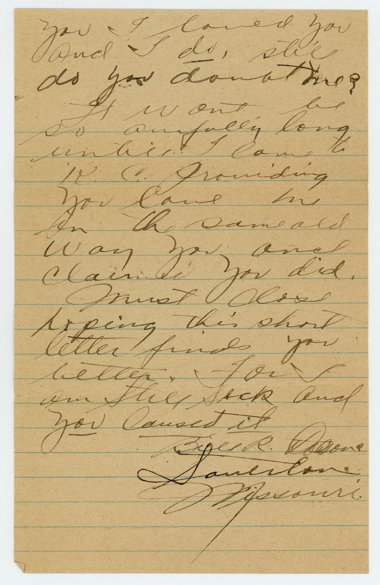 you I loved you and I do, still do you doubt me? It wont be so awfully long untill I come to [Kansas City] providing you love me in the same old way you once claimed you did. Must close hoping this short letter finds you better. For I am Still Sick and you Caused it Bill R. Dotson [ms illegible: 1 wd] Missouri