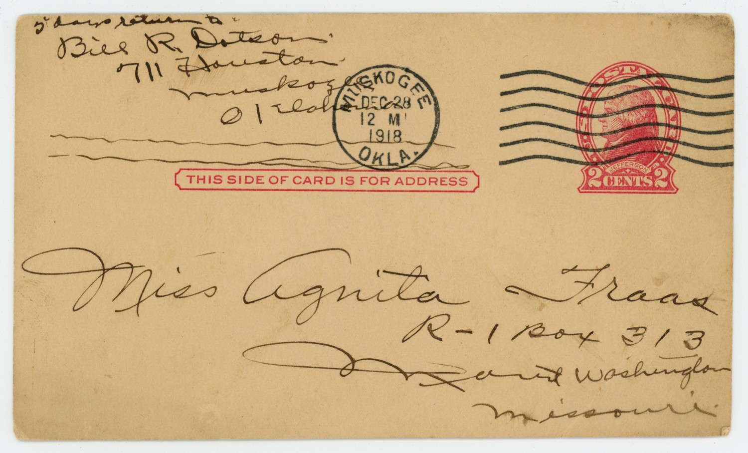 [postcard front] 2 days return to Bill R. Dotson 711 Houston Muskogee Oklahoma Miss Agnita Fraas R-1 Box 313 [ms illegible: 1 wd] Washington Missouri