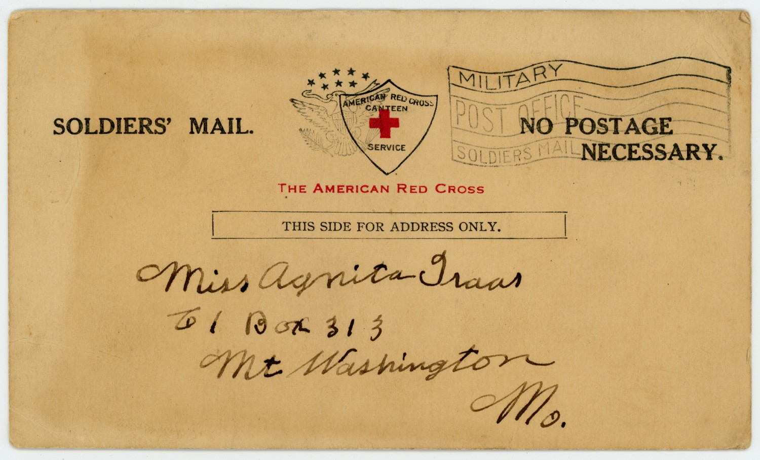 | Source | Parriglio, Charles. Postcard to Agnita Fraas. n.d. Frank X. Fraas Collection. 2002.50. The National World War I Museum, Kansas City, Missouri. |