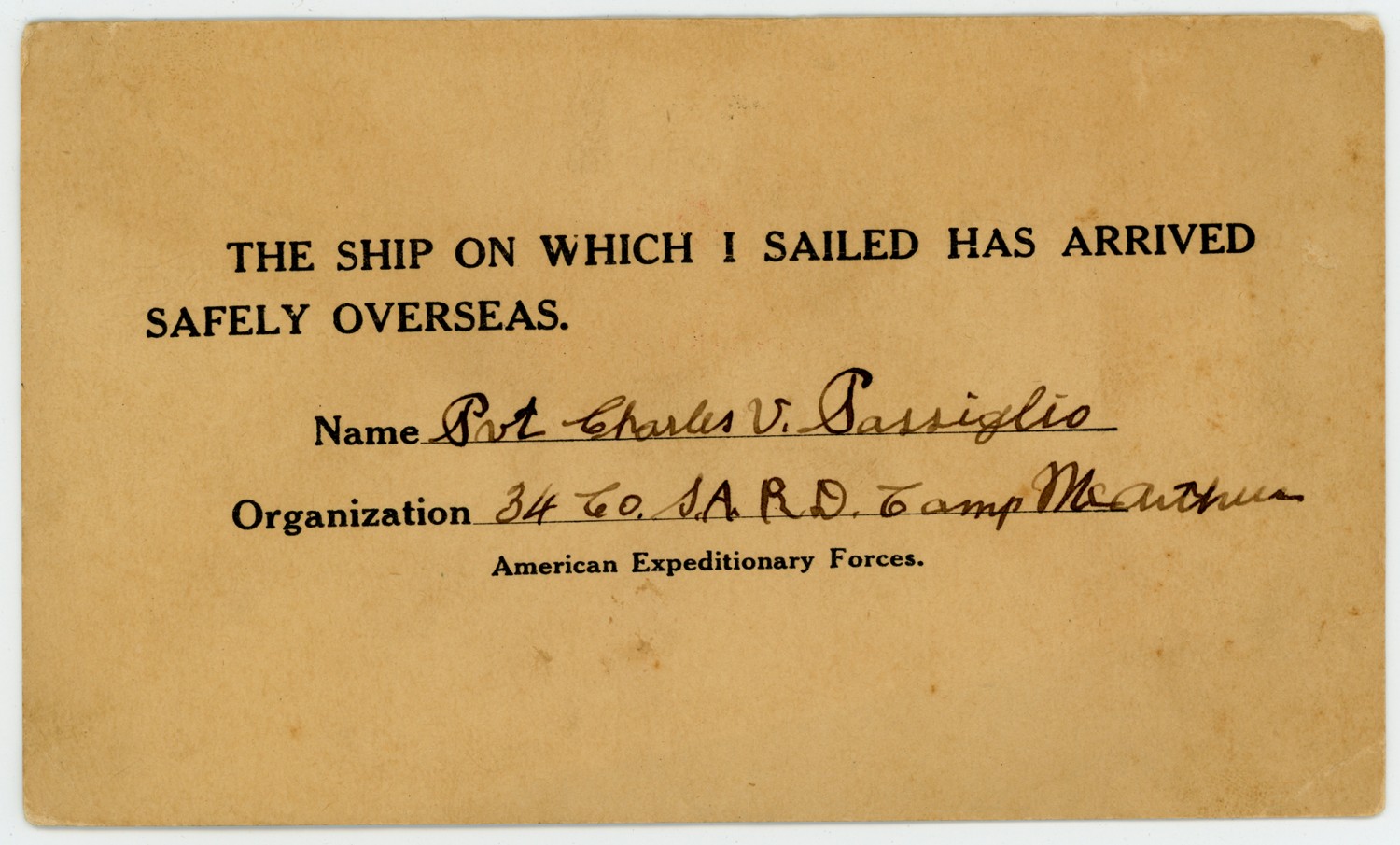 THE SHIP ON WHICH I SAILED HAS ARRIVED SAFELY OVERSEAS. Name Pvt Charles V. Sassigles Organization 34 Co. S.A.R.D. Camp McArthur American Expeditionary Forces.