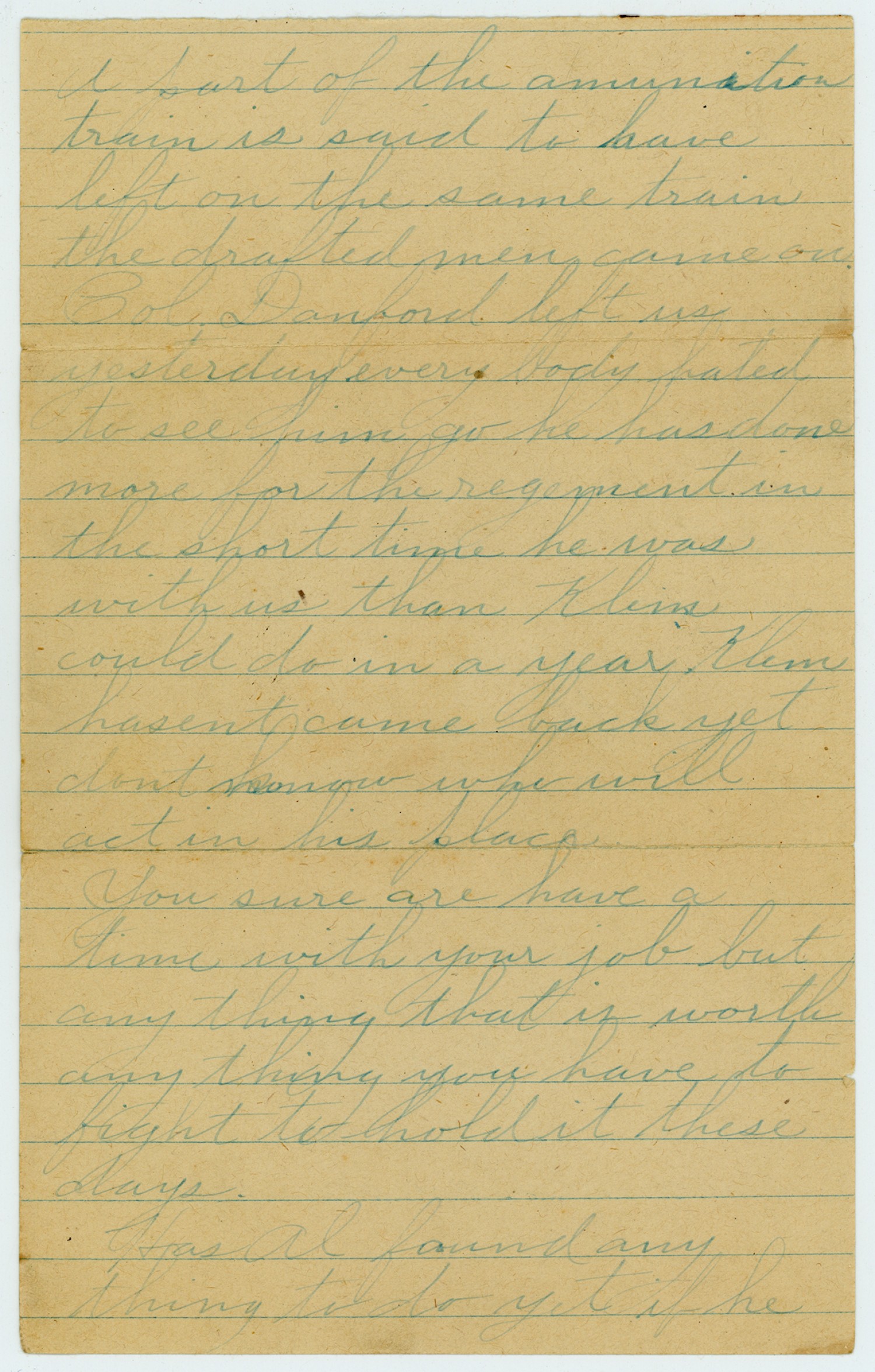 A part of the amunition train is said to have left on the same train the drafted men came on. Col Danford left us yesterday every body hated to see him go he has done more for this regement in the short time he was with us than Klein could do in a year Klein hasent come back yet dont know who will act in his place You sure are have a time with your job but any thing that is worth any thing you have to fight to hold it these days. Has Al found any thing to do yet if he