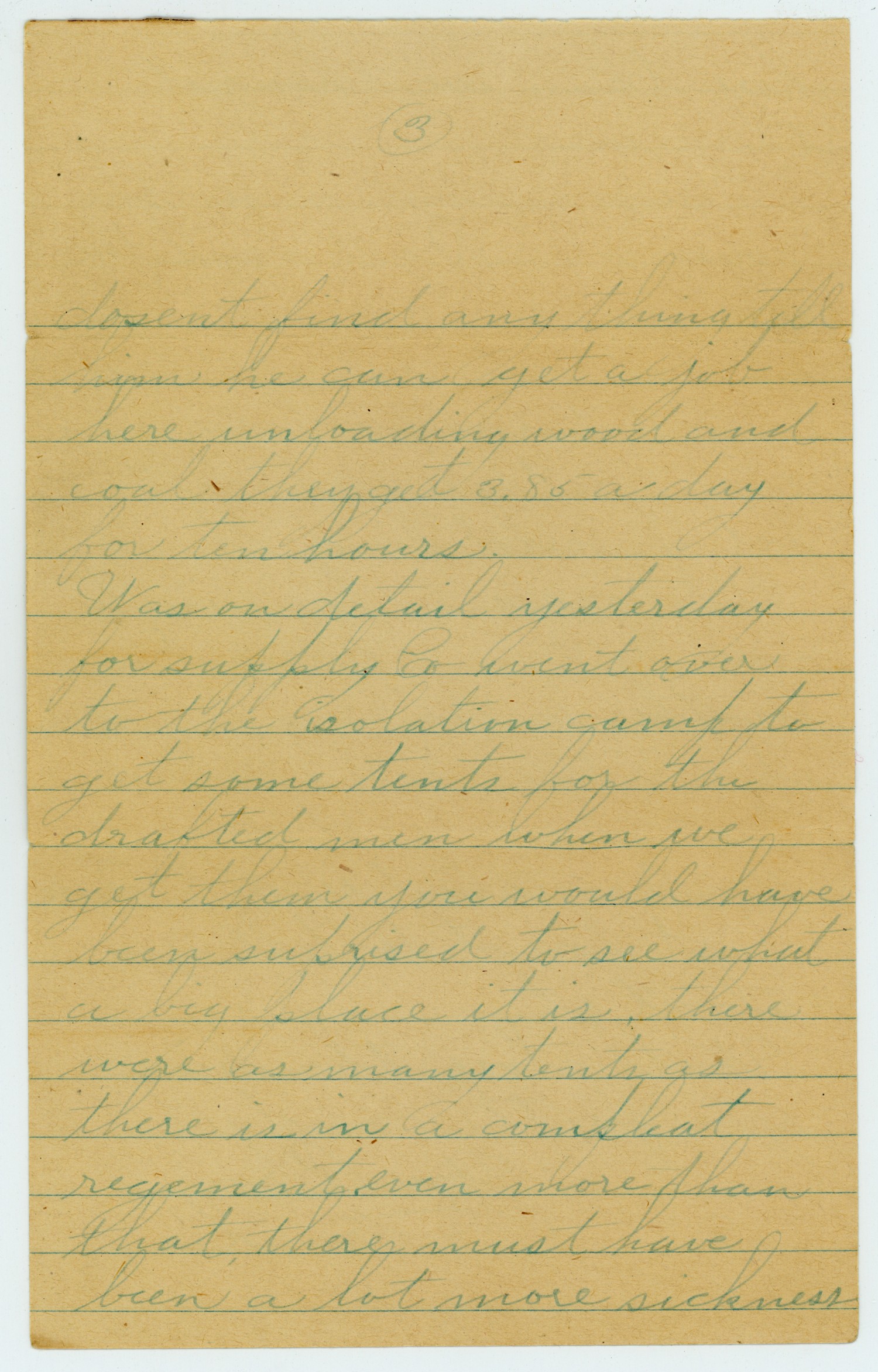 [page 3] dosent find any thing tell him he can get a job here unloading wood and coal they get 3.85 a day for ten hours. Was on detail yesterday for supply Co went over to the isolation camp to get some tents for the drafted men when we get them you would have been suprised to see what a big place it is there were as many tents as there is in a compleat regement even more than that there must have been a lot more sickness