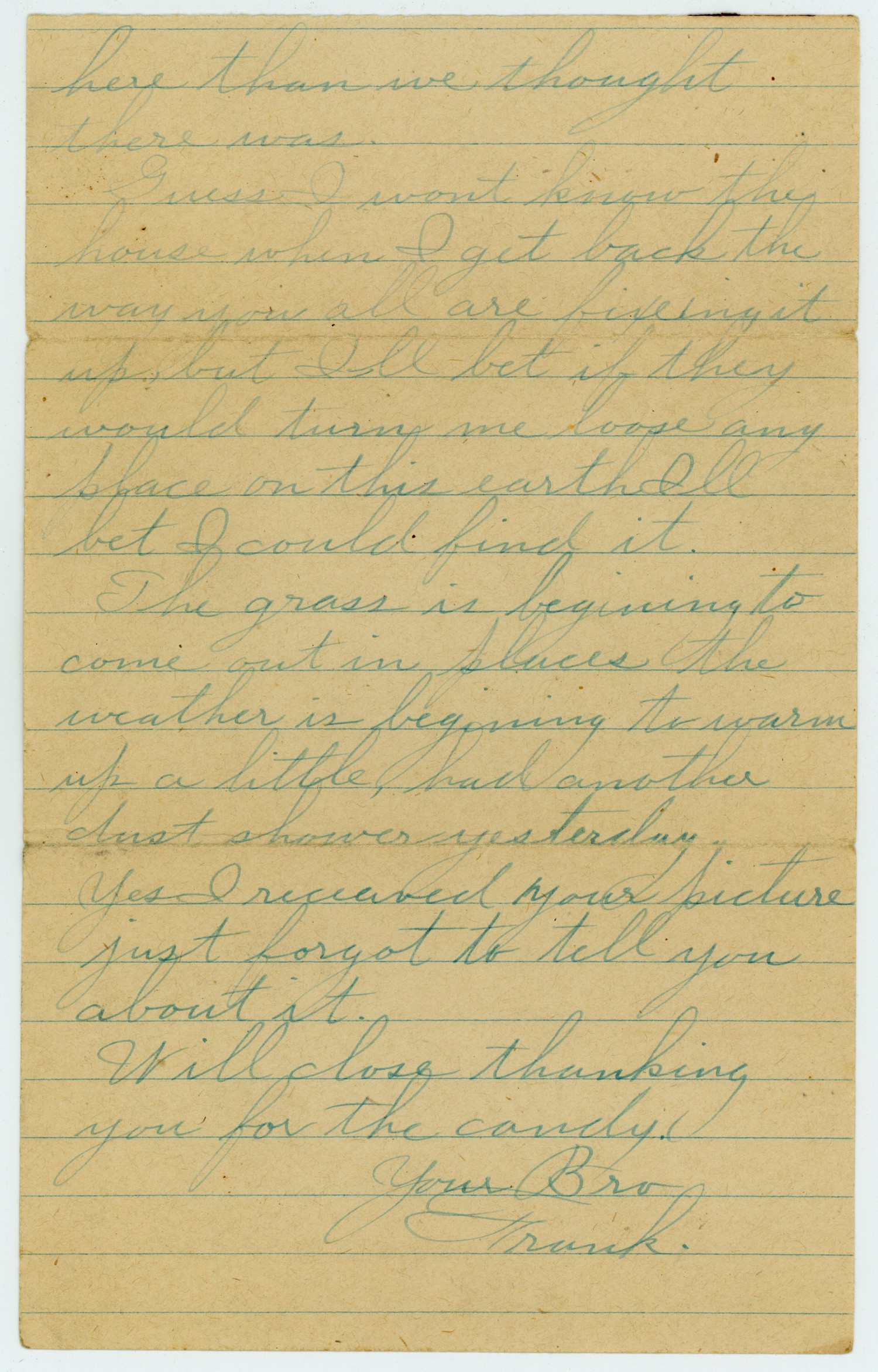 here than we thought there was. Guess I wont know the house when I get back the way you all are fixeing it up, but Ill bet if they would turn me loose any place on this earth Ill bet I could find it. The grass is beginning to come out in places the weather is beginning to warm up a little, had another dust shower yesterday. Yes I receaved your picture just forgot to tell you about it. Will close thanking you for the candy. Your Bro Frank.