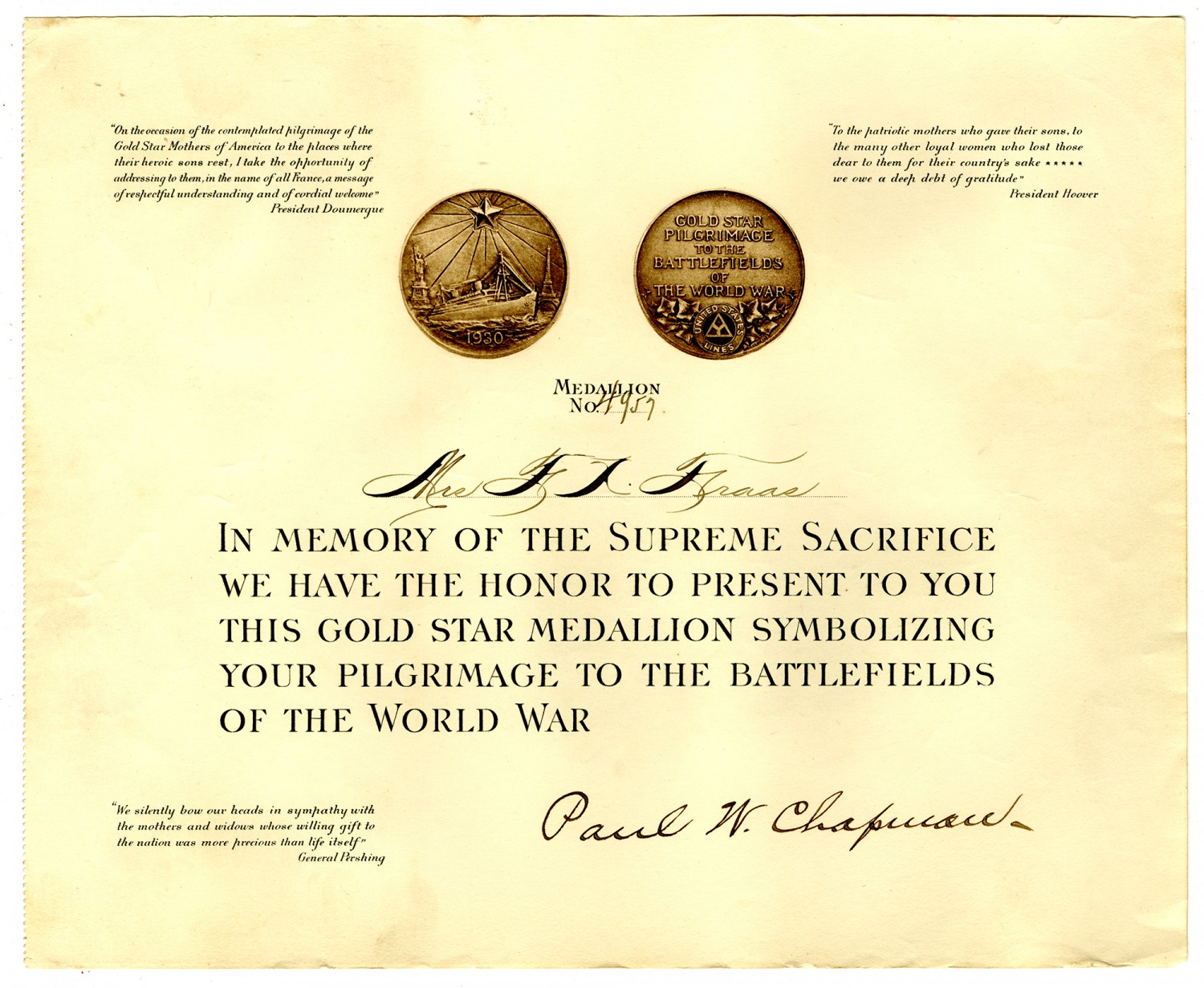 | Source | Chapman, Paul. Frank X. Fraas Gold Star Medallion Certificate. ca. 1930. Frank X. Fraas Collection. 2002.50. The National World War I Museum, Kansas City, Missouri. |