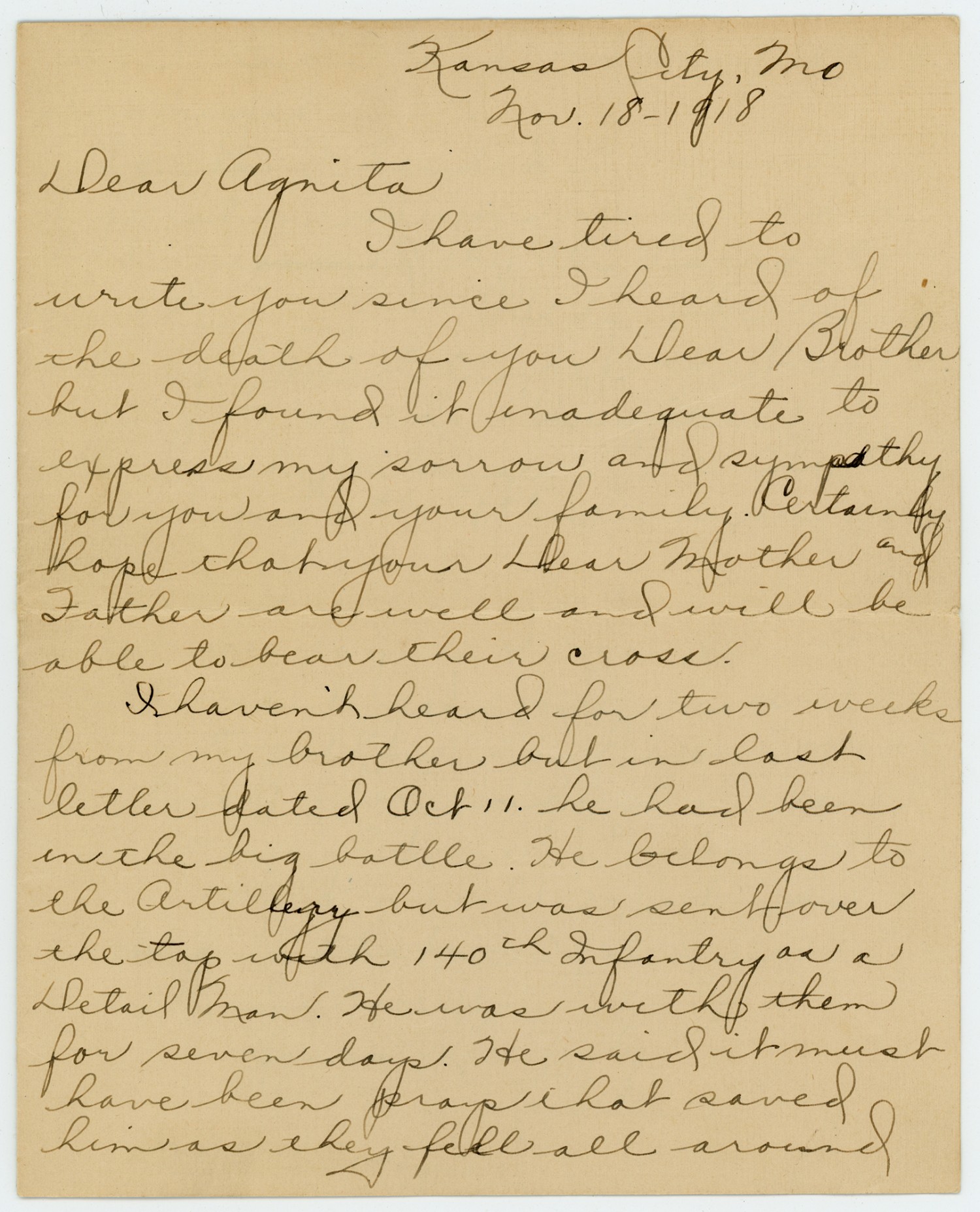 Kansas City, [Missouri] [November] 18 - 1918 Dear Agnita I have tired to write you since I heard of the death of you Dear Brother but I found it inadequate to express my sorrow and sympathy for you and your family. Certainly hope that your Dear Mother and Father are well and will be able to bear their cross. I haven