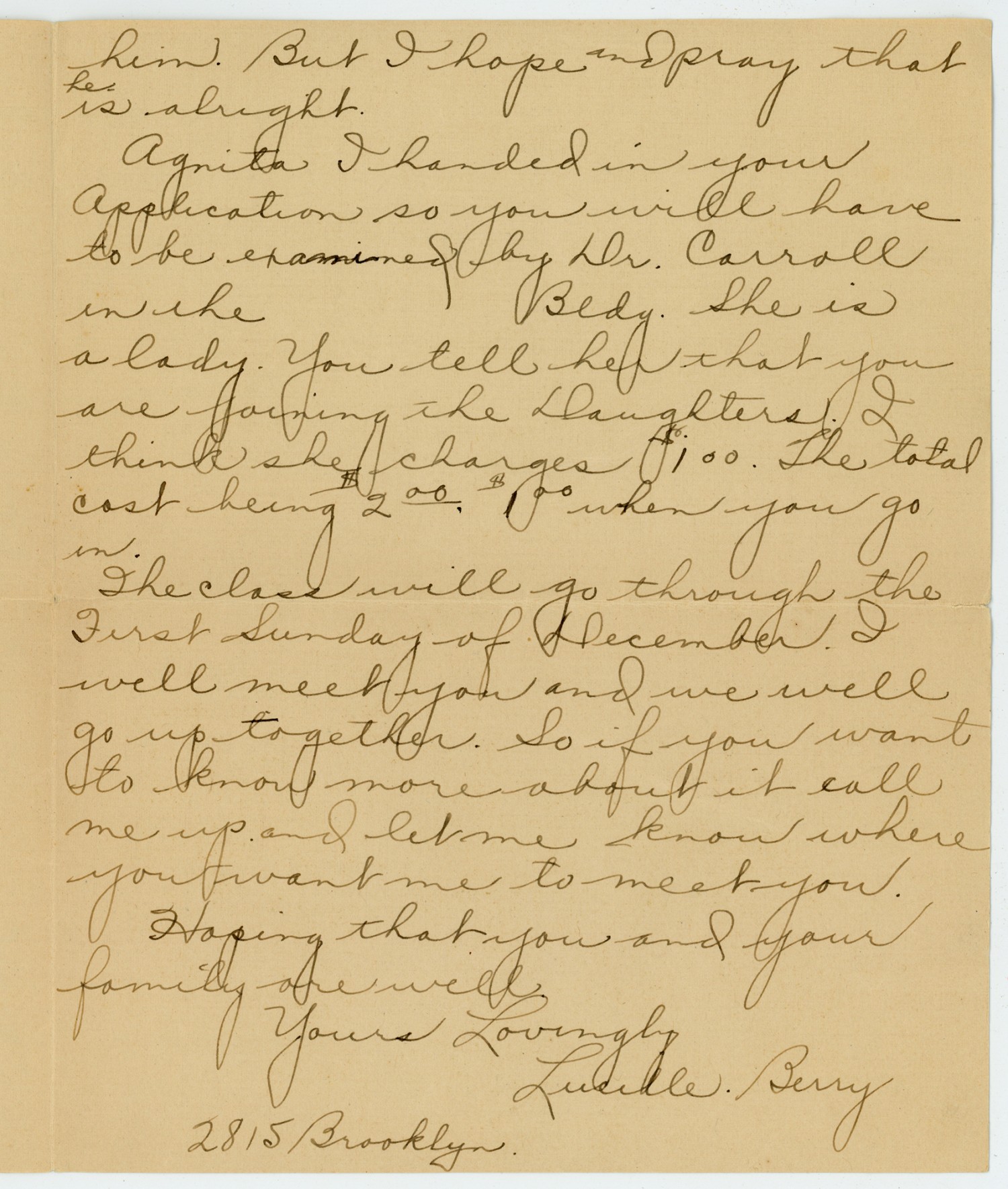him. But I hope and pray that he is alright. Agnita I handed in your Application so you will have to be examined by Dr. Carroll in the Bldg. She is a lady. You tell her that you are joining the Daughters. I think she charges $100. The total cost being $200. $100 when you go in. The class will go through the First Sunday of December. I well meet you and we will go up together. So if you want to know more about it call me up and let me know where you want me to meet you. Hoping that you and your family are well. Yours Lovingly Lucille Berry 2815 Brooklyn.