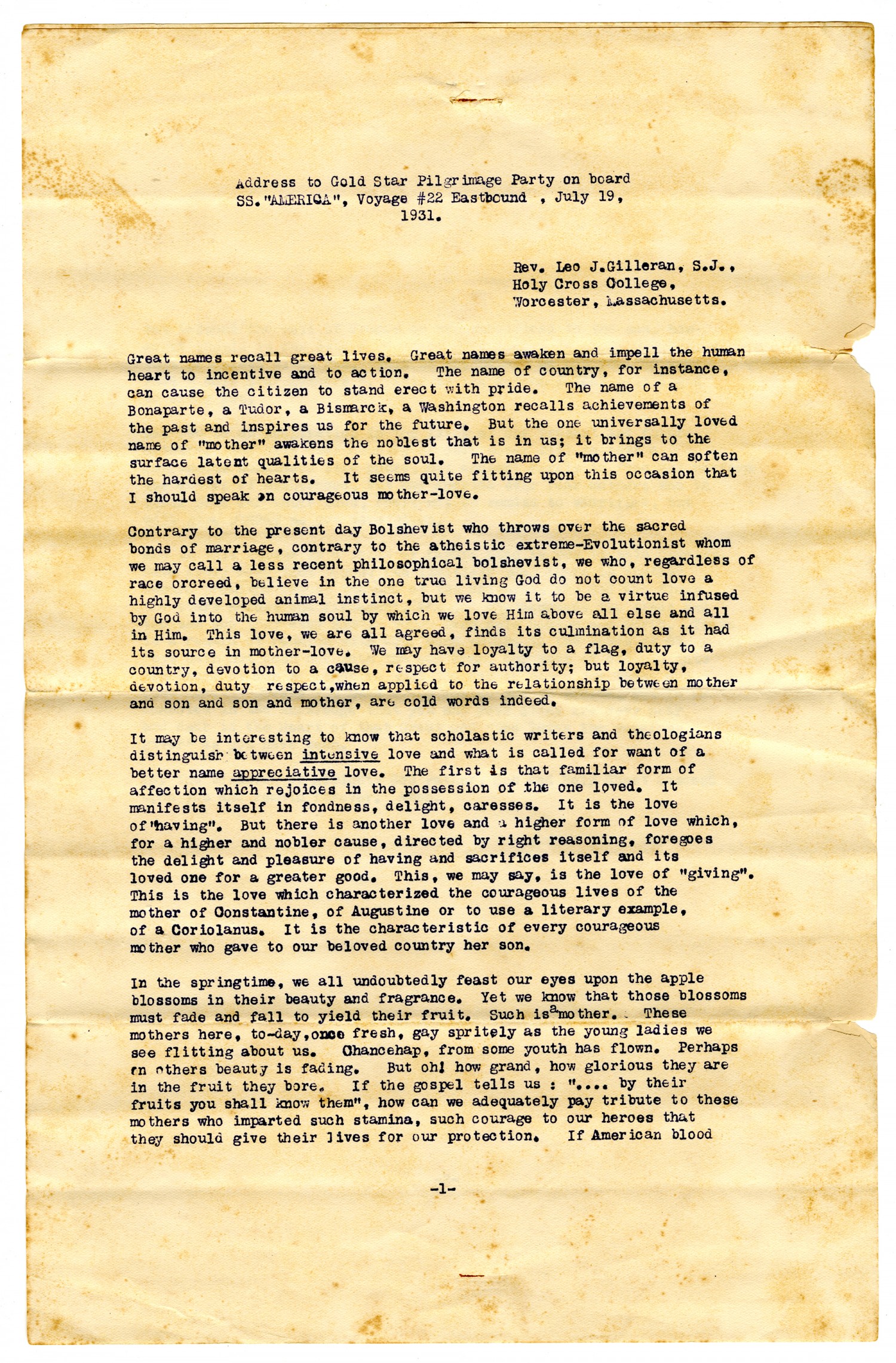 Rev. Leon Gilleran Address to Gold Star Pilgrimage Party - July 29, 1931