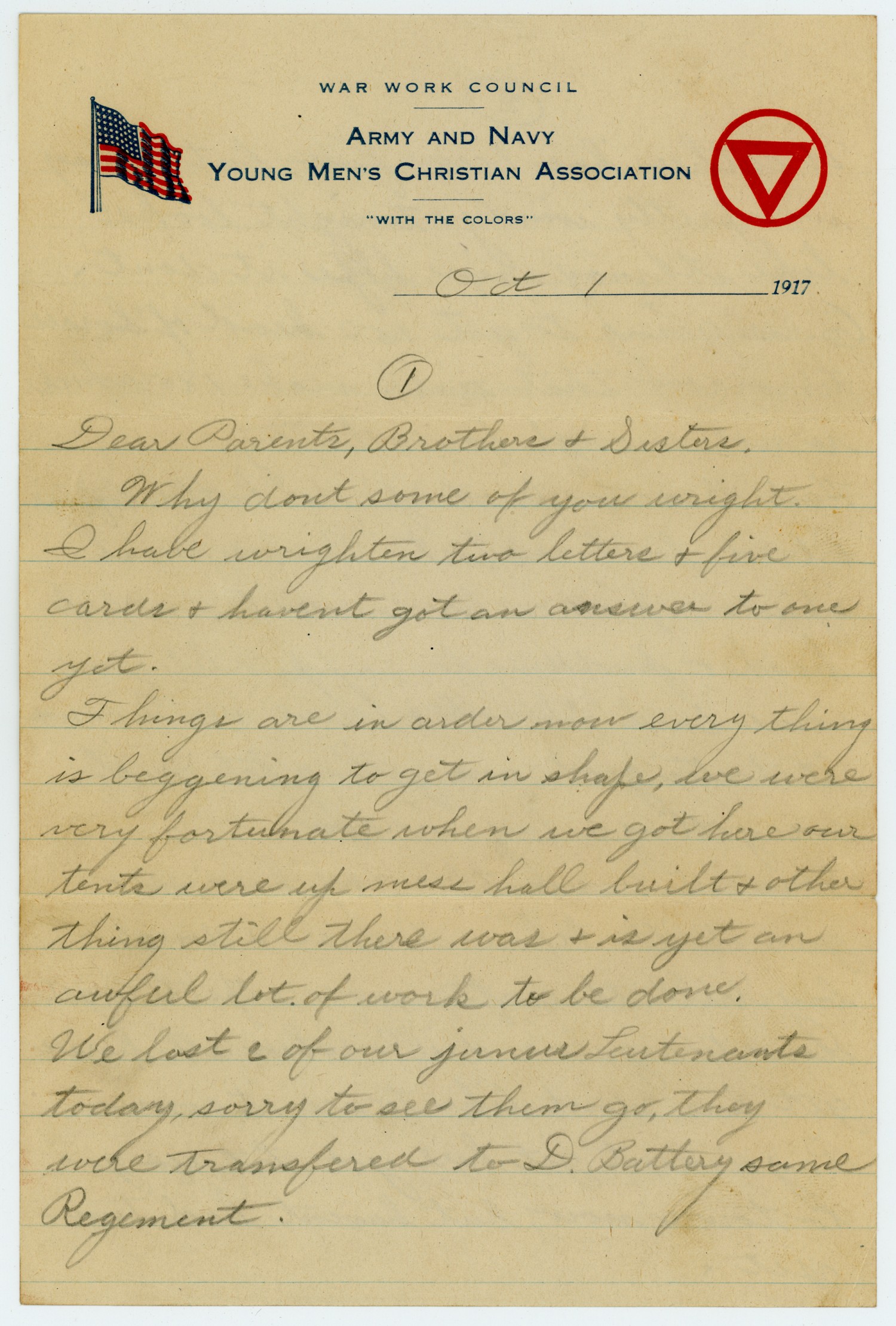 [page 1] [October] 1 1917 Dear Parents, Brothers & Sisters. Why dont some of you wright I have wrighten two letters & five cards & havent got an answer to one yet. Things are in order now every thing is beginning to get in shape, we were very fortunate when we got here our tents were up mess hall built & other thing still there was & is yet an awful lot of work to be done. We lost 2 of our junur Leutenants today, sorry to see them go, they were transferred to D. Battery some Regiment.