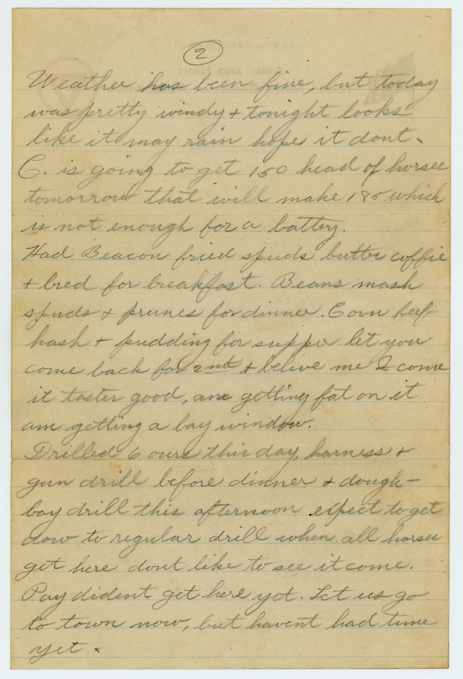 [page 2] Weather has been fine, but today was pretty windy & tonight looks like it may rain hope it dont - C. is going to get 150 head of horses tomorrow that will make 185 which is not enough for a battery. Had Beacon fried spuds butter coffie & bred for breakfast. Beans mash spuds & prunes for dinner. Corn beef hash & pudding for supper let you come back for 2nd & belive me I come it tastes good, am getting fat on it am getting a bay window. Drilled 6 ours this day, harness & gun drill before dinner & dough-boy drill this afternoon expect to get dow to regular drill when all horses get here dont like to see it come. Pay didnt get here yet. Let us go to town now, but havent had time yet.