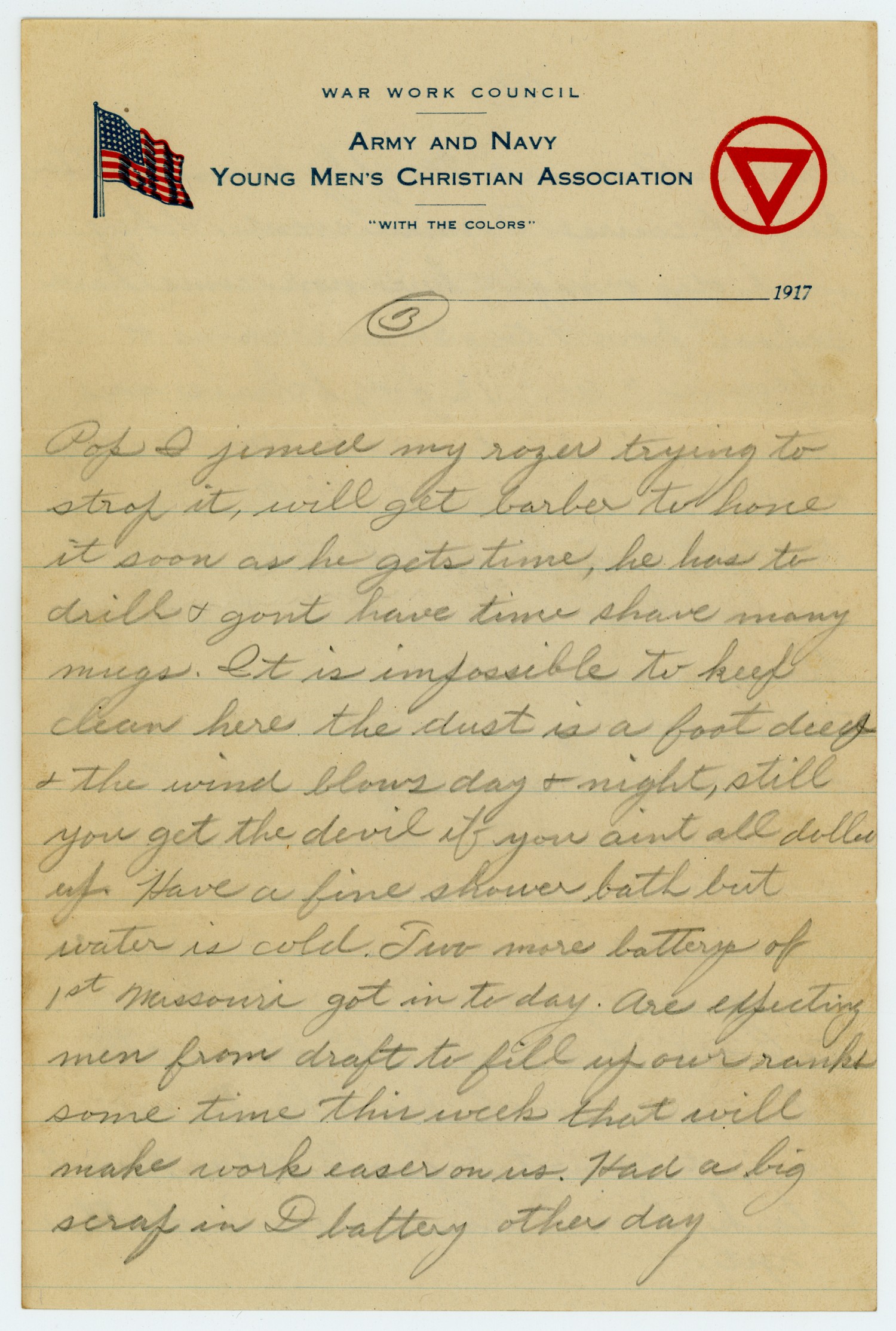 [page 3] Pop I jimed my razer trying to strop it, will get barber to hone it soon as he gets time, he has to drill & gont have time shave many mugs. It is impossible to keep clean here the dust is a foot deep & the wind blows day & night, still you get the devil if you aint all dolled up. Have a fine shower bath but water is cold. Two more batterys of 1st Missouri got in to day. Are expecting men from draft to fill up our ranks some time this week that will make work easer on us. Had a big scrap in D battery other day