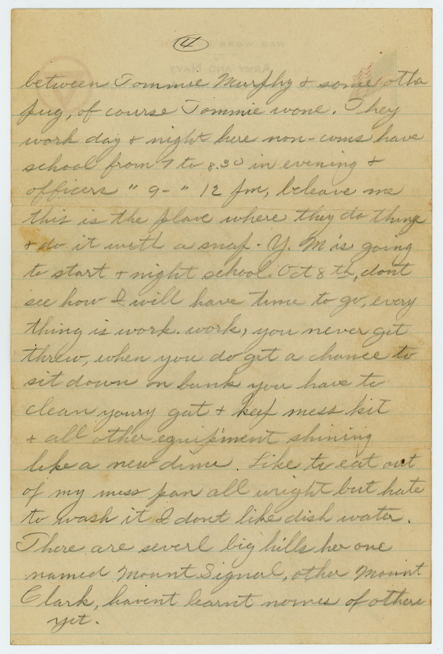 [page 4] between Tommie Murphy & some other pug, of course Tommie wone. They work day & night here non-coms have school from 7 to 8:30 in evening & officers