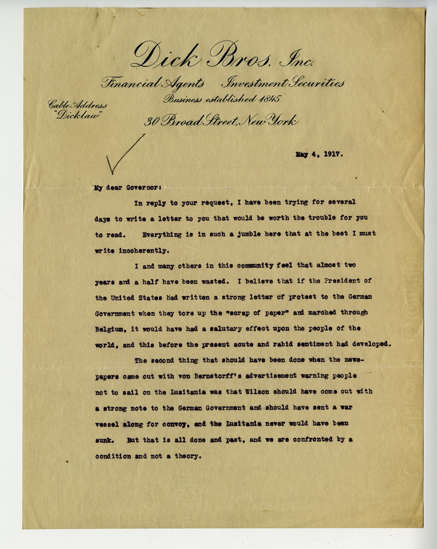 [Dick Bros. Inc. Financial Agents Investment Securities letterhead] May 4, 1917. My dear Governor: In reply to your request, I have been trying for several days to write a letter to you that would be worth the trouble for you to read. Everything is in such a jumble here that at the best I must write incoherently. I and many others in this community feel that almost two years and half have been wasted. I believe that if the President of the United States had written a strong letter of protest to the German Government when they tore up the