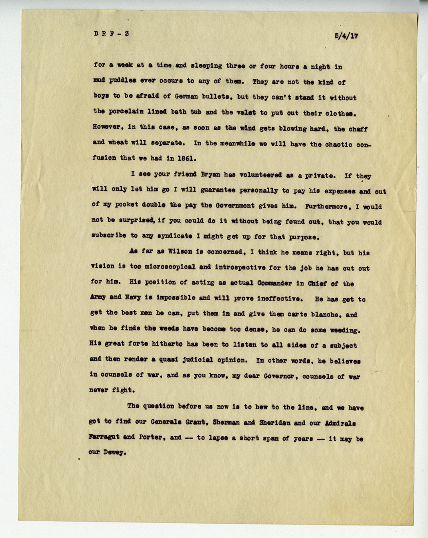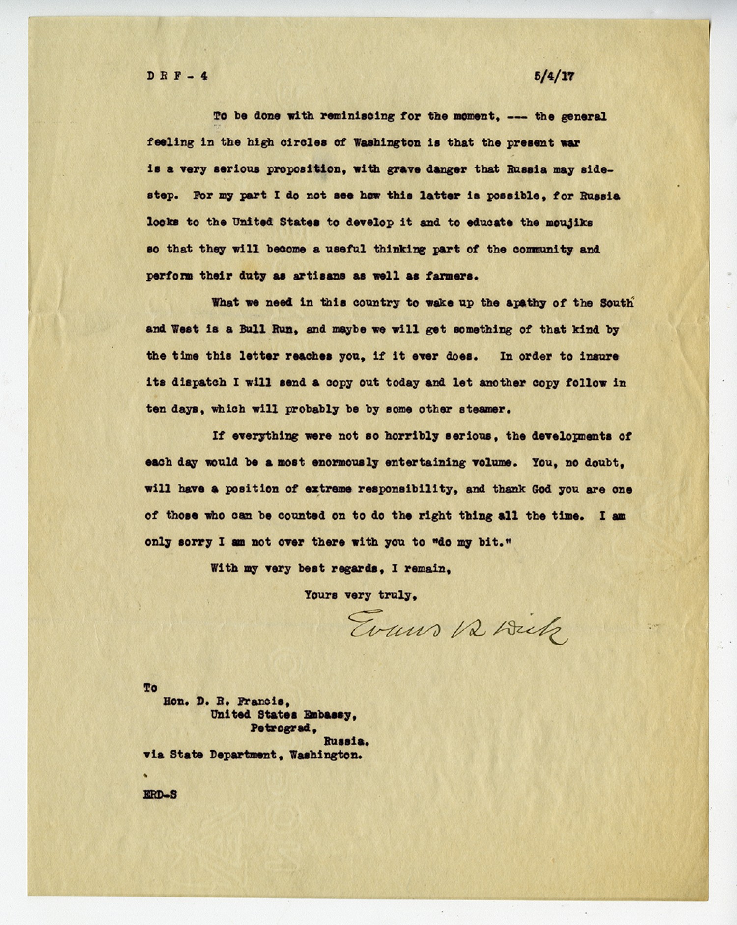 DFR - [Page 4] 5/4/[1917] To be done with reminiscing for the moment, --- the general feeling in the high circles of Washington is that the present war is a very serious proposition, with grave danger that Russia may side-step. For my part I do not see how this latter is possible, for Russia looks to the United States to develop it and to educate the moujiks so that they will become a useful thinking part of the community and perform their duty as artisans as well as farmers. What we need in this country to wake up the apathy of the South and West is a Bull Run, and maybe we will get something of that kind by the time this letter reaches you, if it ever does. In order to insure its dispatch I will send a copy out today and let another copy follow in ten days, which will probably be by some other steamer. If everything were not so horribly serious, the developments of each day would be a most enormously entertaining volume. You, no doubt, will have a position of extreme responsibility, and thank God you are one of those who can be counted on to do the right thing all the time. I am only sorry I am not over there with you to