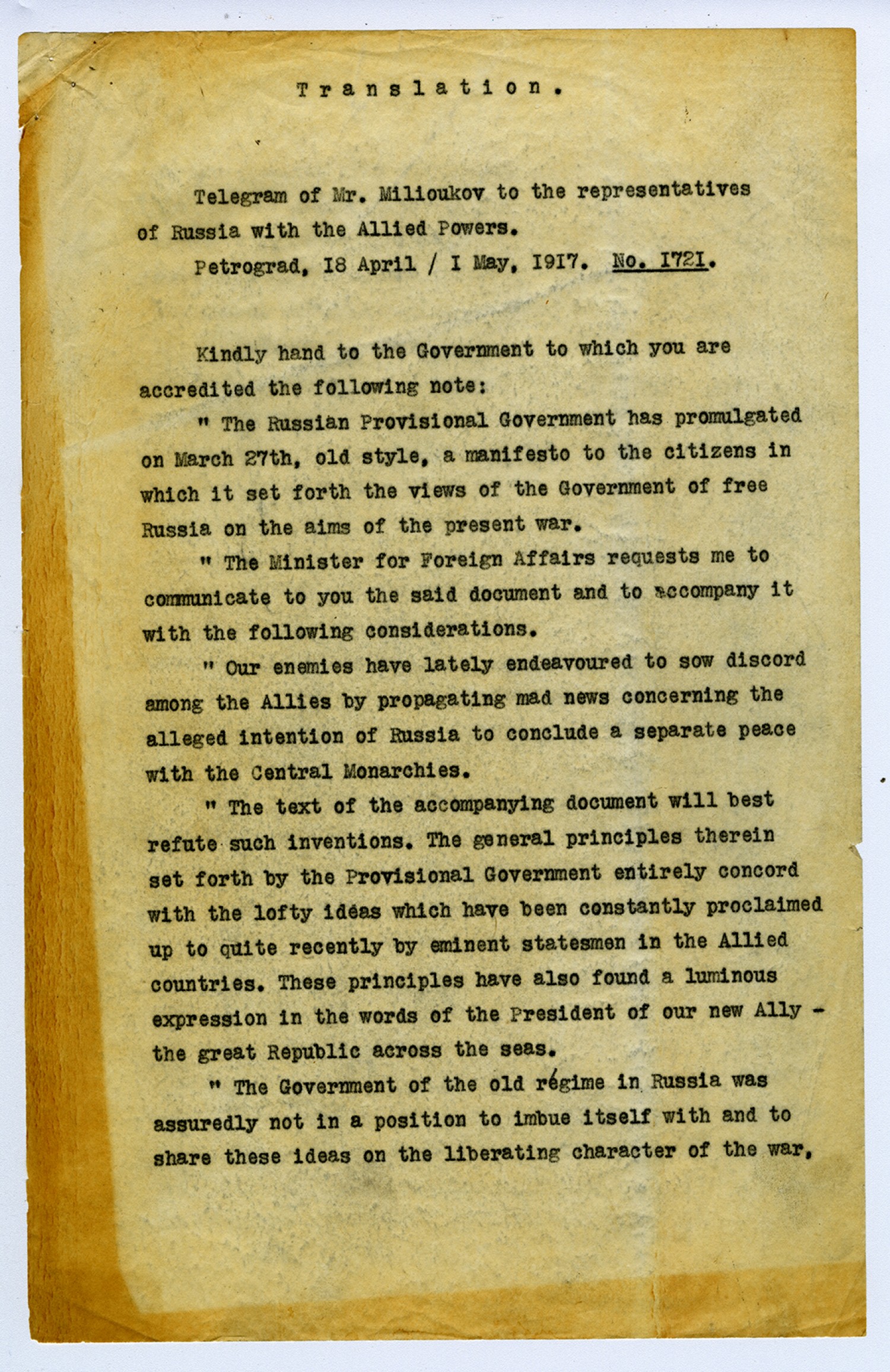 Translation. Telegram of Mr. Milioukov to the representatives of Russia with the Allied Powers. Petrograd, 18 April [May 1, 1917]. No. [1721]. Kindly hand to the Government to which you are accredited the following note: