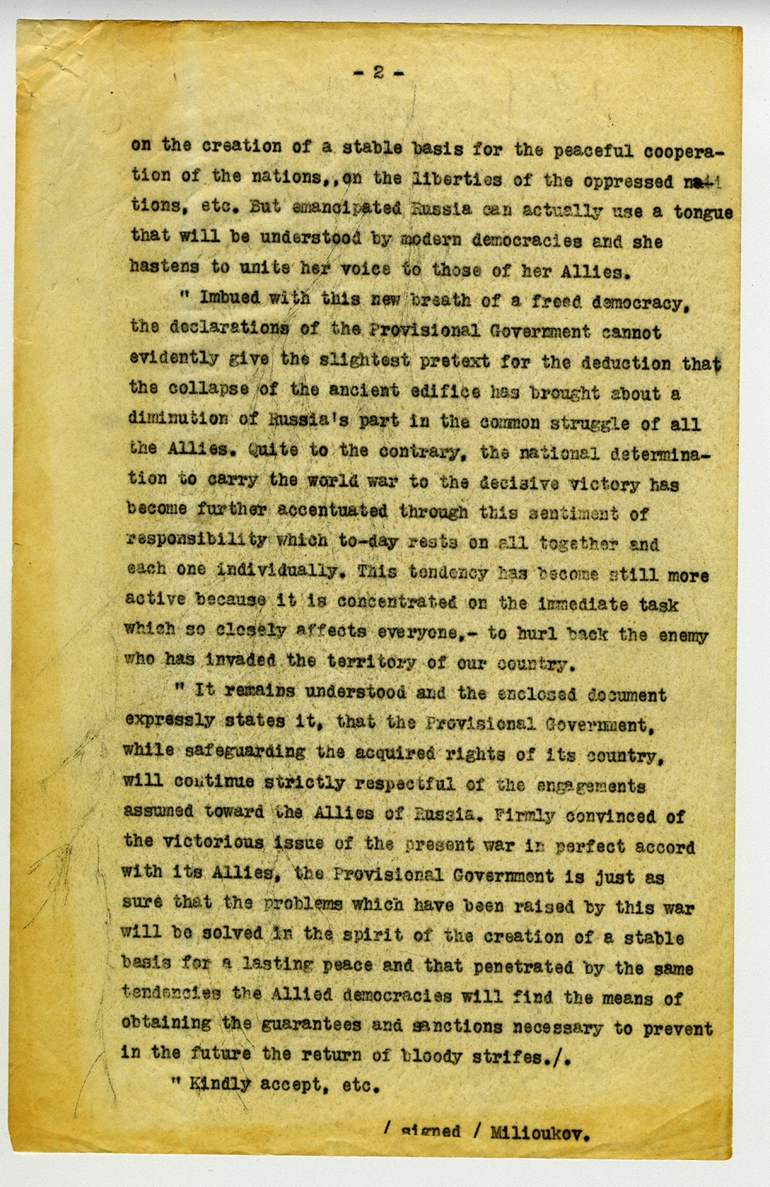 [page 2] on the creation of a stable basis for the peaceful cooperation of the nations,, on the liberties of the oppressed nations, etc. But emancipated Russia can actually use a tongue that will be understood by modern democracies and she hastens to unite her voice to those of her Allies.