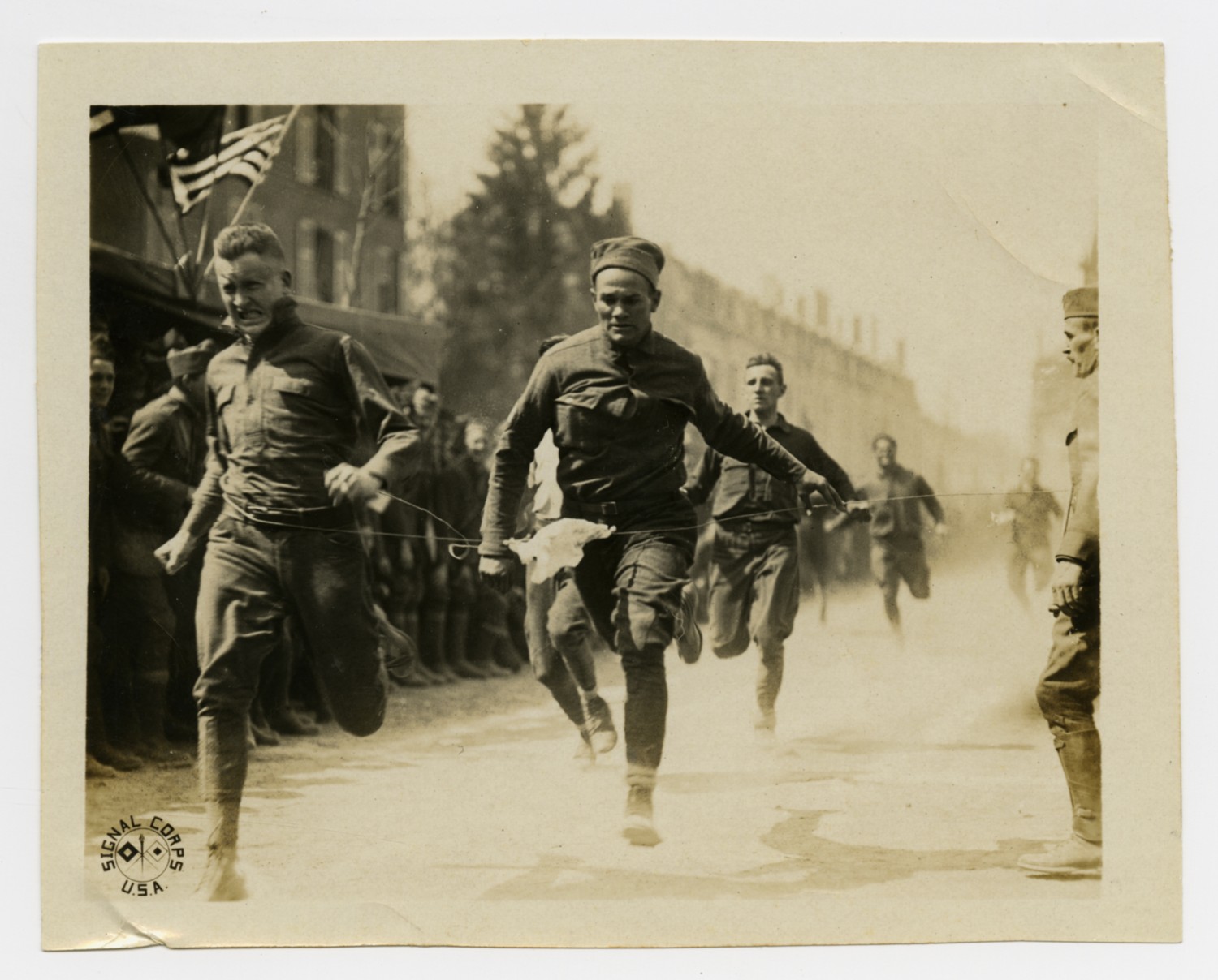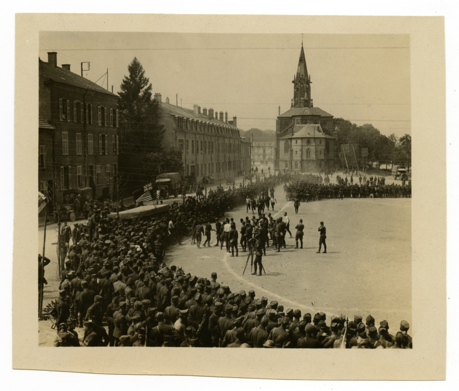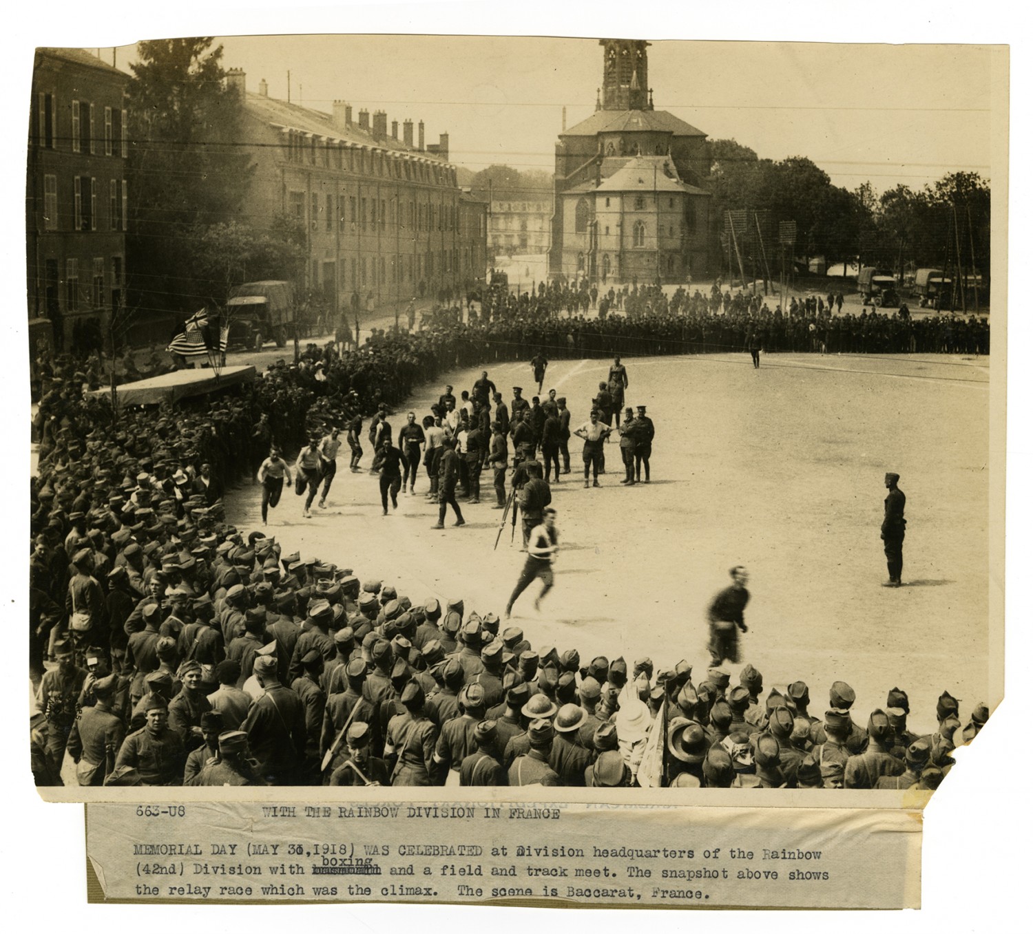 This photograph of the 42nd Division's Memorial Day celebration race in Baccarat, France is one of several Signal Corps photographs in a collection compiled by Ruby Garrett. Garrett, a Kanas City lawyer, served as Chief Signal Officer of the 117th Field Signal Battalion, 42nd Division, during World War I.
