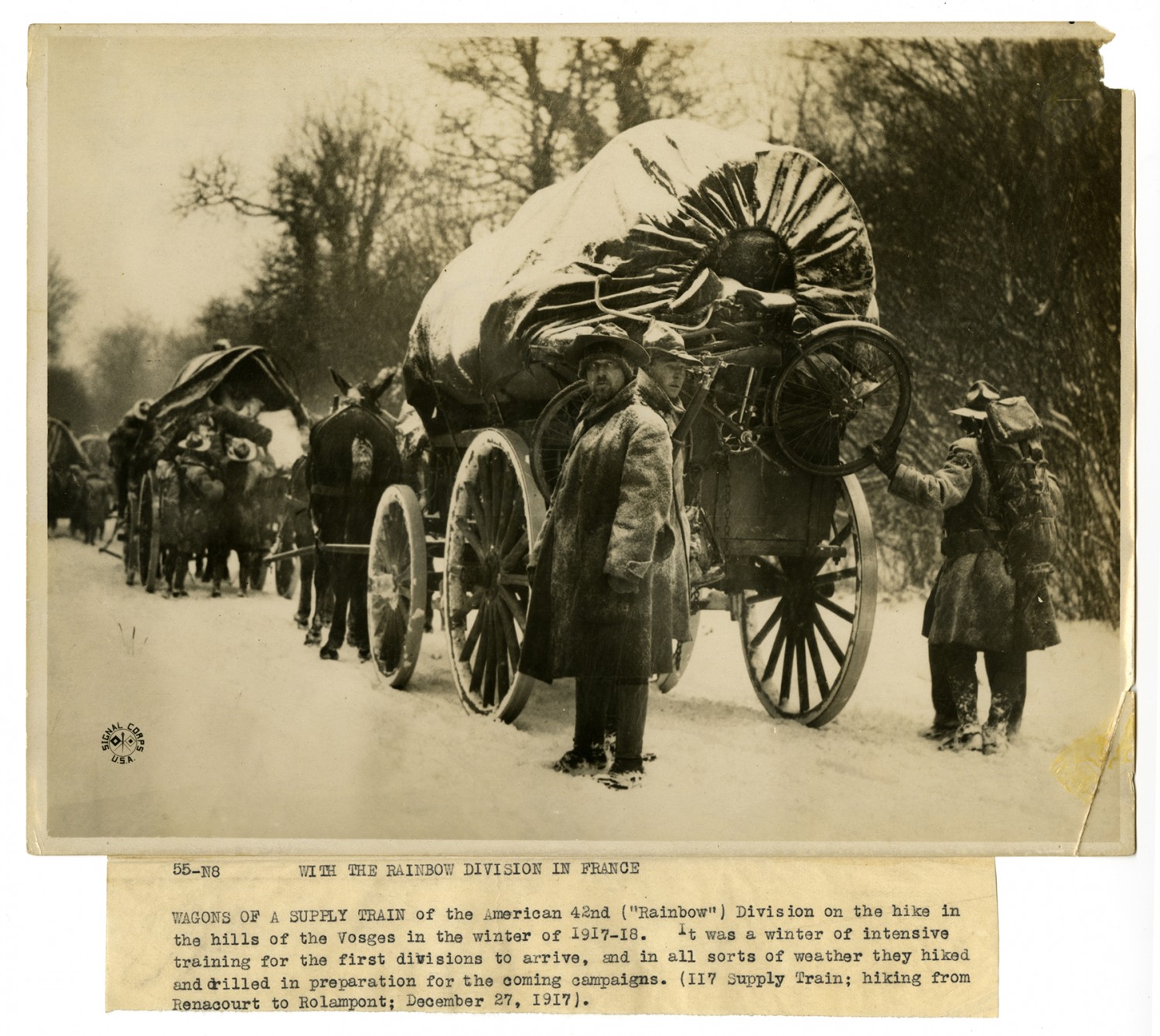 55-N8 WITH THE RAINBOW DIVISION IN FRANCE WAGONS OF A SUPPLY TRAIN of the American 42nd ("Rainbow") Division on the hike in the hills of the Vosges in the winter of 1917-18. It was a winter of intensive training for the first divisions to arrive, and in all sorts of weather they hiked and drilled in preparation for the coming campaigns. (117 Supply Train; hiking from Renacourt to Rolampont; December 27, 1917).