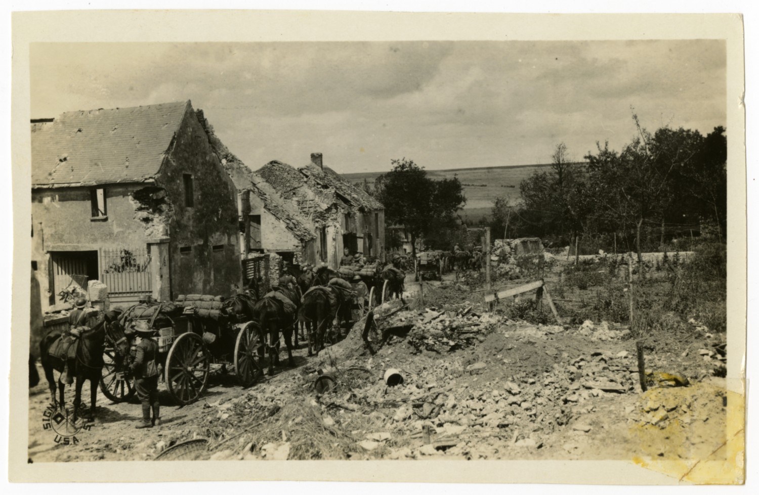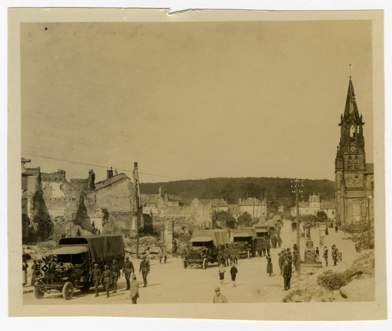 This photograph of a military convoy passing through a bombarded European town is one of several Signal Corps photographs in a collection compiled by Ruby Garrett. Garrett, a Kanas City lawyer, served as Chief Signal Officer of the 117th Field Signal Battalion, 42nd Division, during World War I.