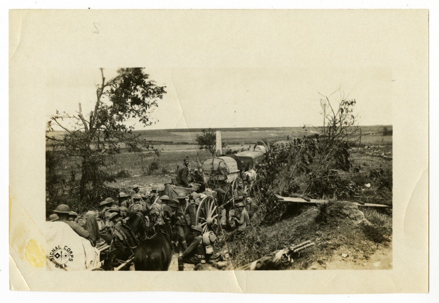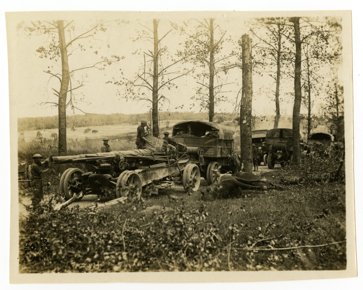 This photograph of a military convoy moving through a forest is one of several Signal Corps photographs in a collection compiled by Ruby Garrett. Garrett, a Kanas City lawyer, served as Chief Signal Officer of the 117th Field Signal Battalion, 42nd Division, during World War I.
