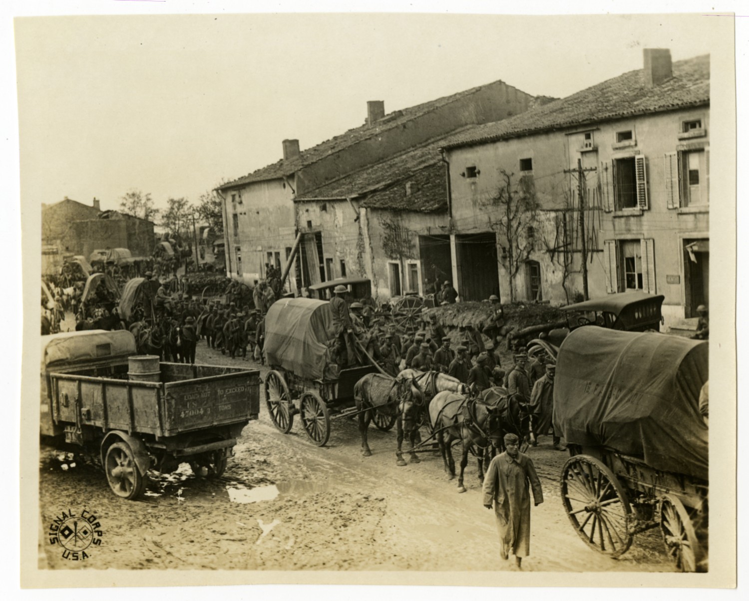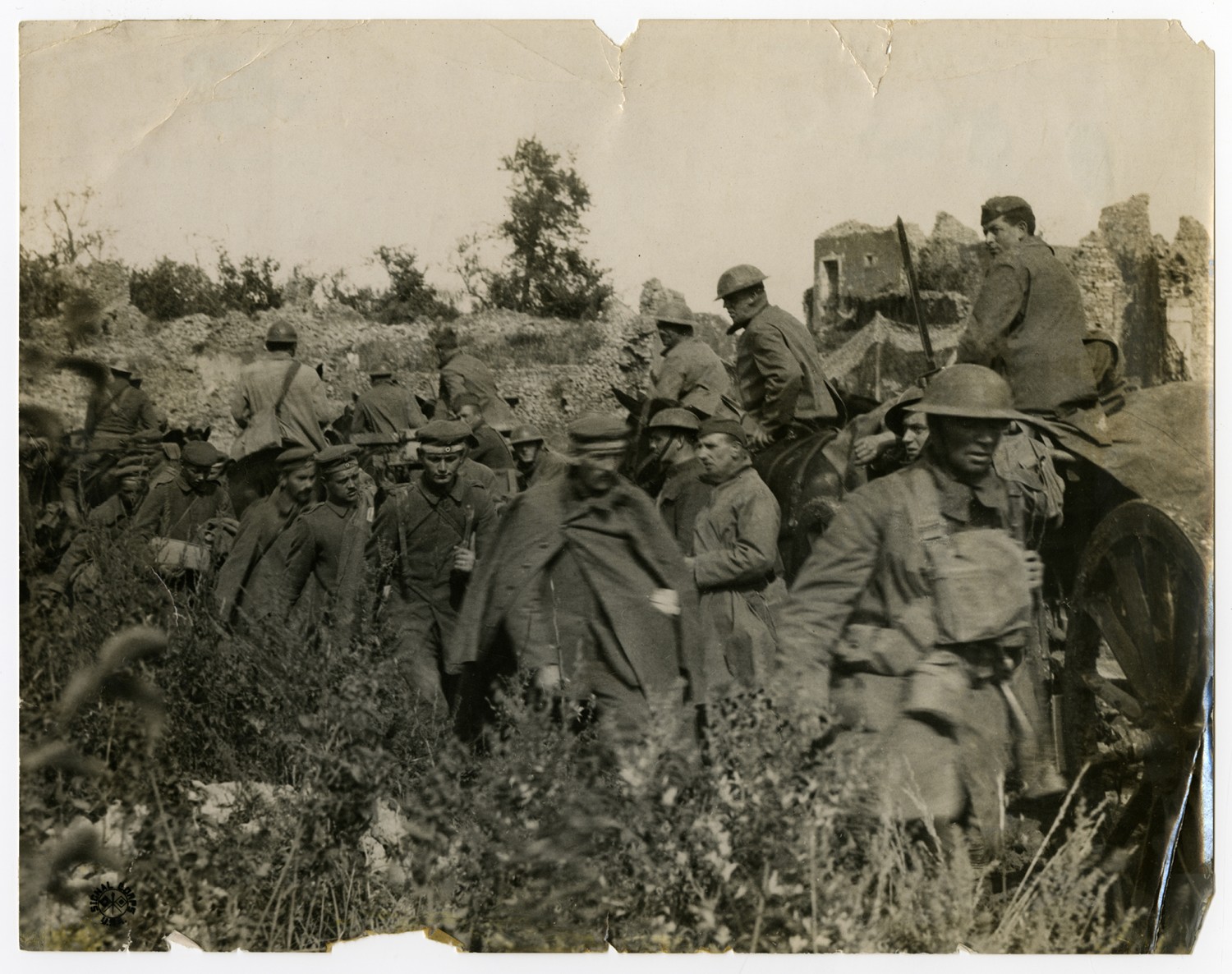 This photograph of German prisoners of war carrying supplies is one of several Signal Corps photographs in a collection compiled by Ruby Garrett. Garrett, a Kanas City lawyer, served as Chief Signal Officer of the 117th Field Signal Battalion, 42nd Division, during World War I.