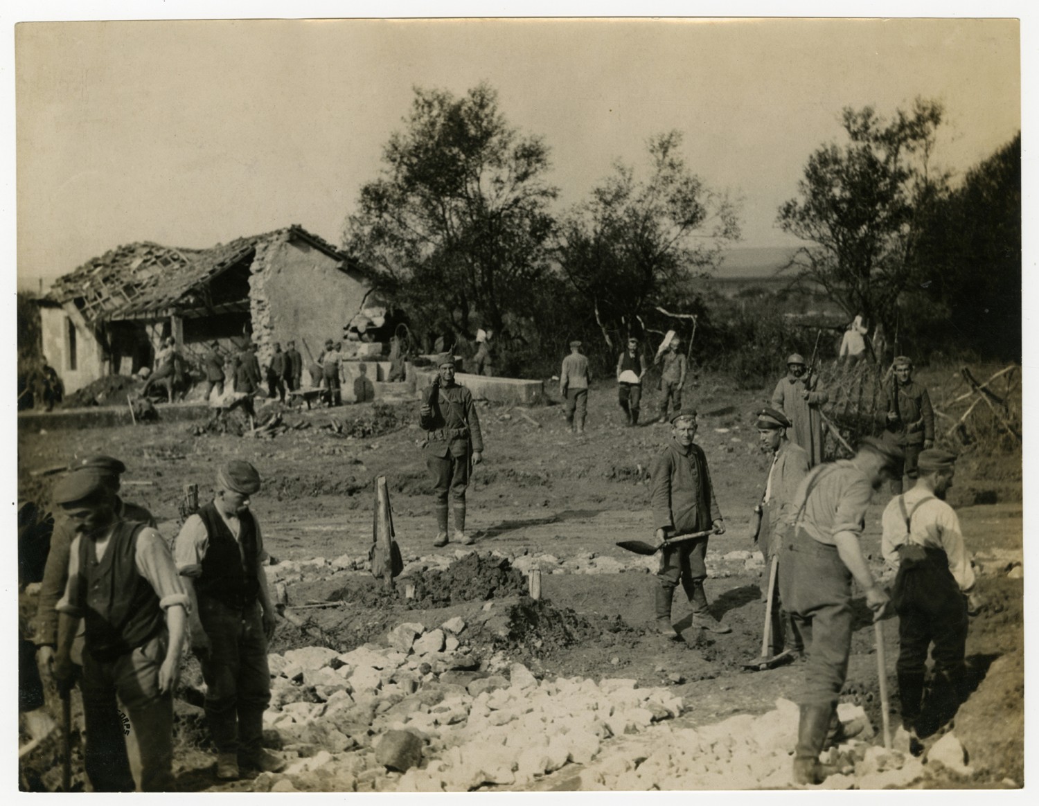 This photograph of German prisoners digging near a dilapidated building, belongs to a collection compiled by Ruby Garrett, the Kansas City, Missouri lawyer who served as Chief Signal Officer of the 42nd Division during World War I.