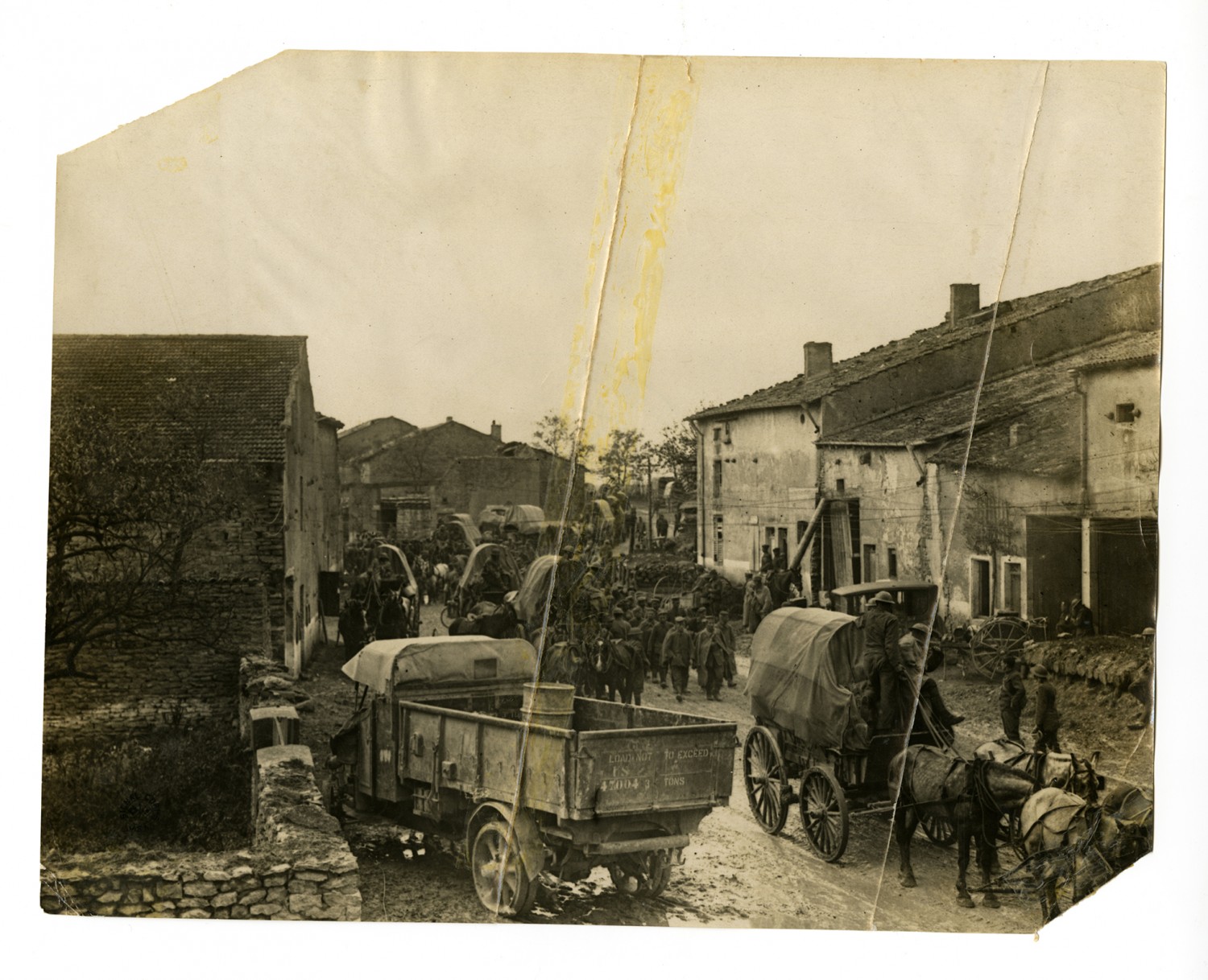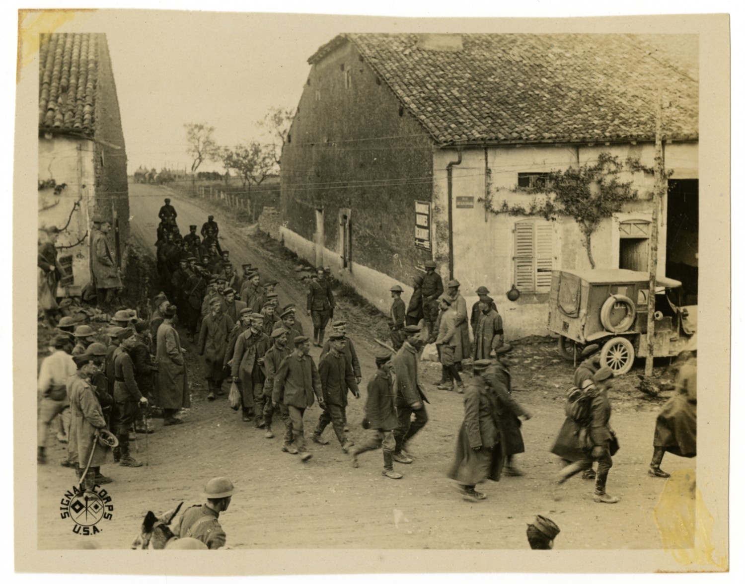 This photograph of German war prisoners being marched through a European town is one of several Signal Corps photographs in a collection compiled by Ruby Garrett. Garrett, a Kanas City lawyer, served as Chief Signal Officer of the 117th Field Signal Battalion, 42nd Division, during World War I.