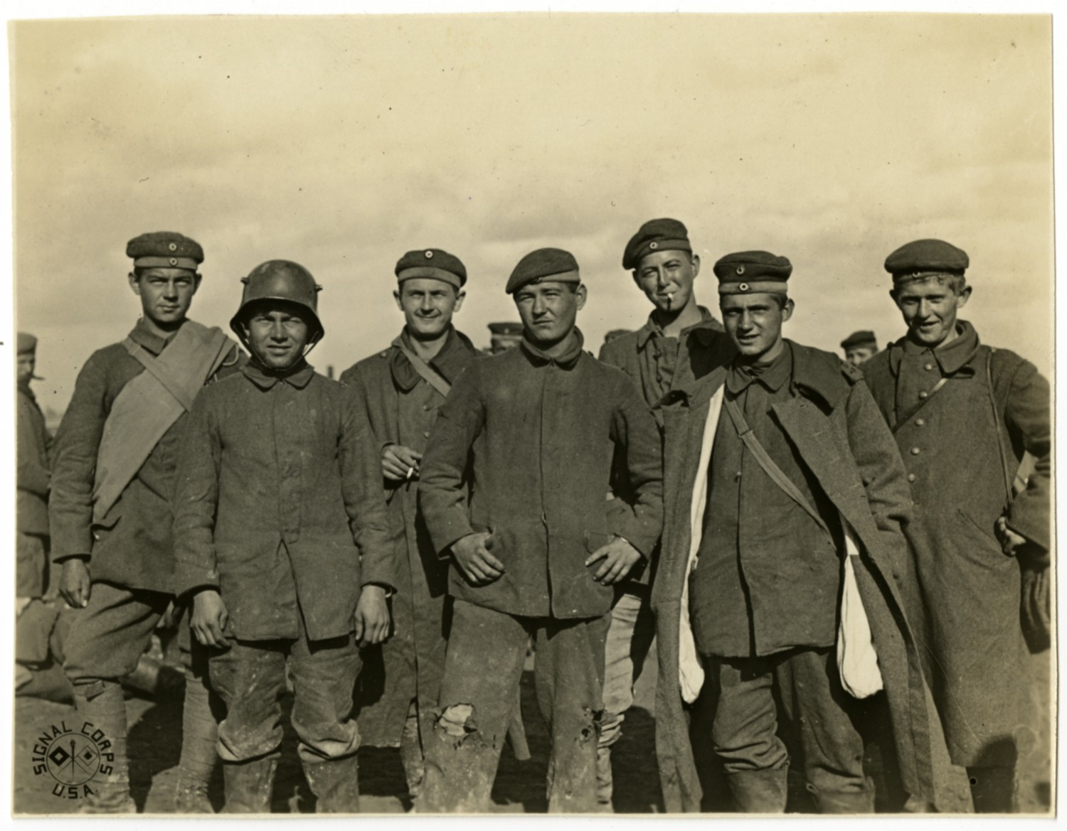 This photograph of German prisoners of war is one of several Signal Corps photographs in a collection compiled by Ruby Garrett. Garrett, a Kanas City lawyer, served as Chief Signal Officer of the 117th Field Signal Battalion, 42nd Division, during World War I.