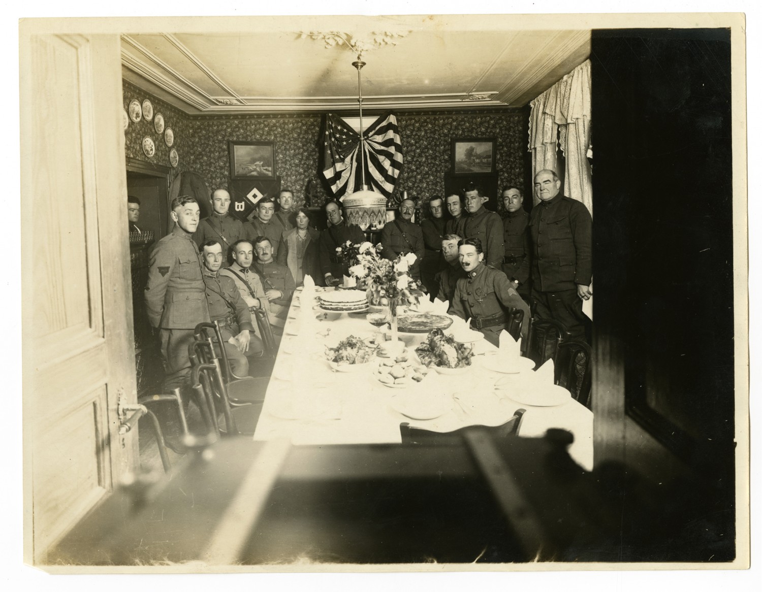 Photograph of a group of soldiers, YMCA officers, Maude Radford Warren, and Ruby Garrett [center, with glasses], Richard T. Smith [standing third from right] surrounding a dining room table. Garrett, a Kansas City, Missouri lawyer, served as Chief Signal Officer of the 42nd Division during World War I.