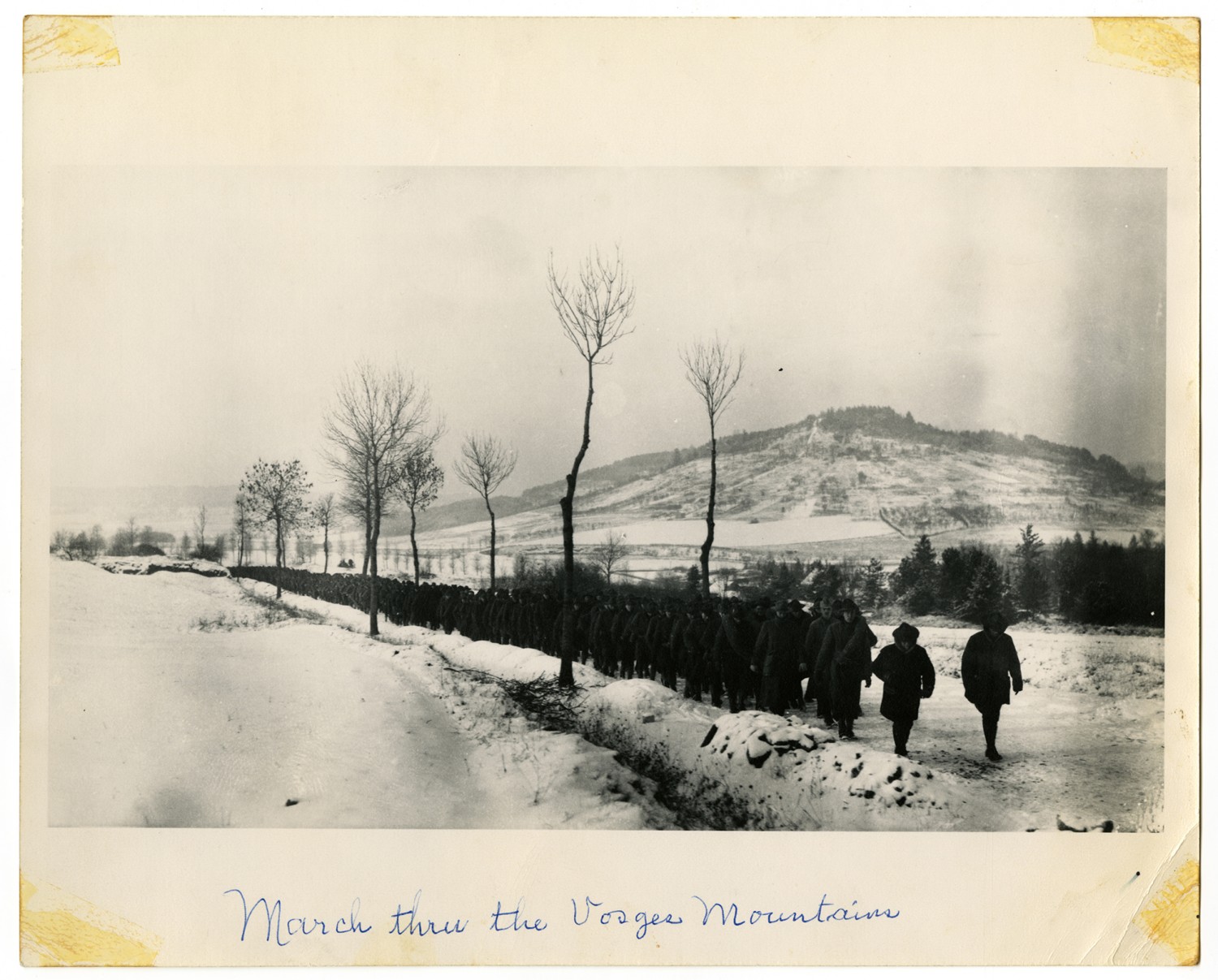 This photograph depicts the 117th Field Signal Battalion, 42nd Division, marching through the Vosges Mountains. The transcription on the reverse states "The 117th Field Signal Battalion, 42nd Div enroute from Roncourt to Rolanport, Haute Marne, France." The photograph belongs to a collection compiled by Ruby Garrett, a Kansas City, Missouri lawyer who served as Chief Signal Officer in the 42nd Division during World War I.