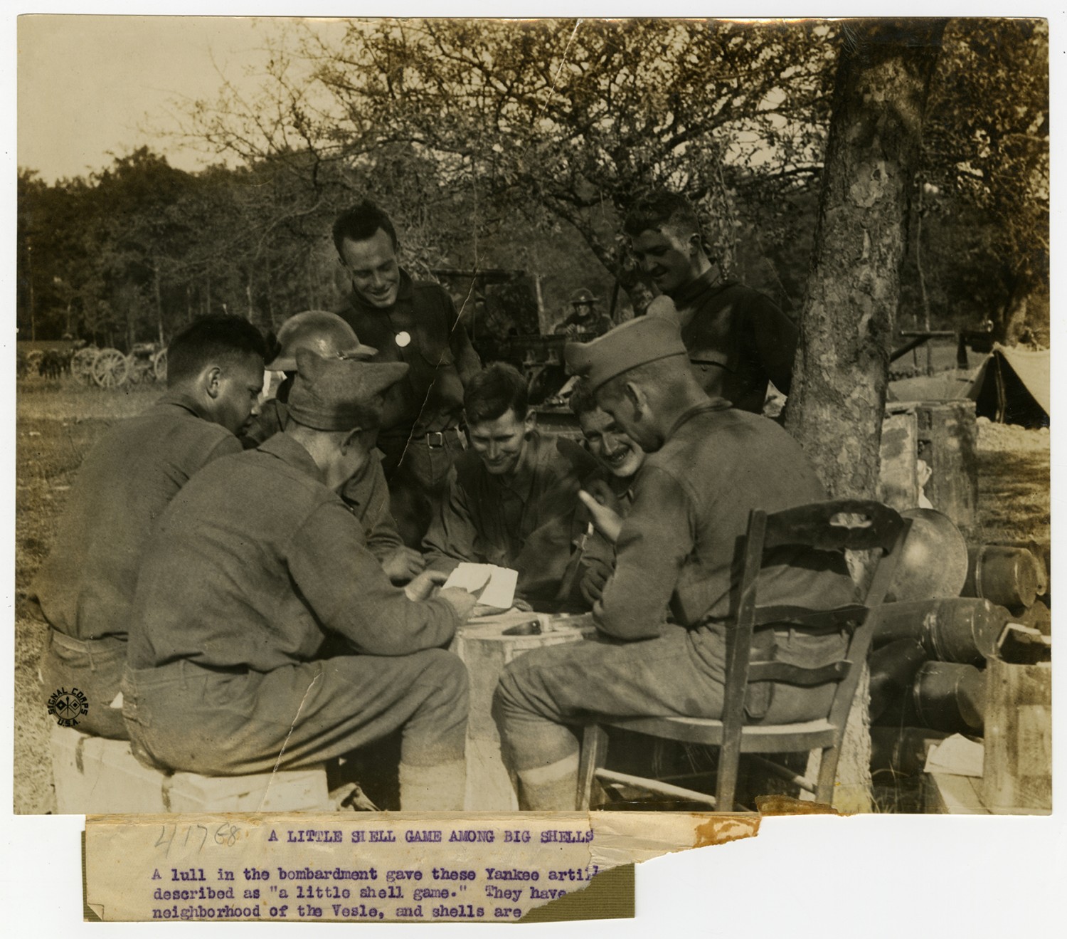 | Description | This photograph of a little shell game among big shells, belongs to a collection compiled by Ruby Garrett, the Kansas City, Missouri lawyer who served as Chief Signal Officer of the 42nd Division during World War I. |