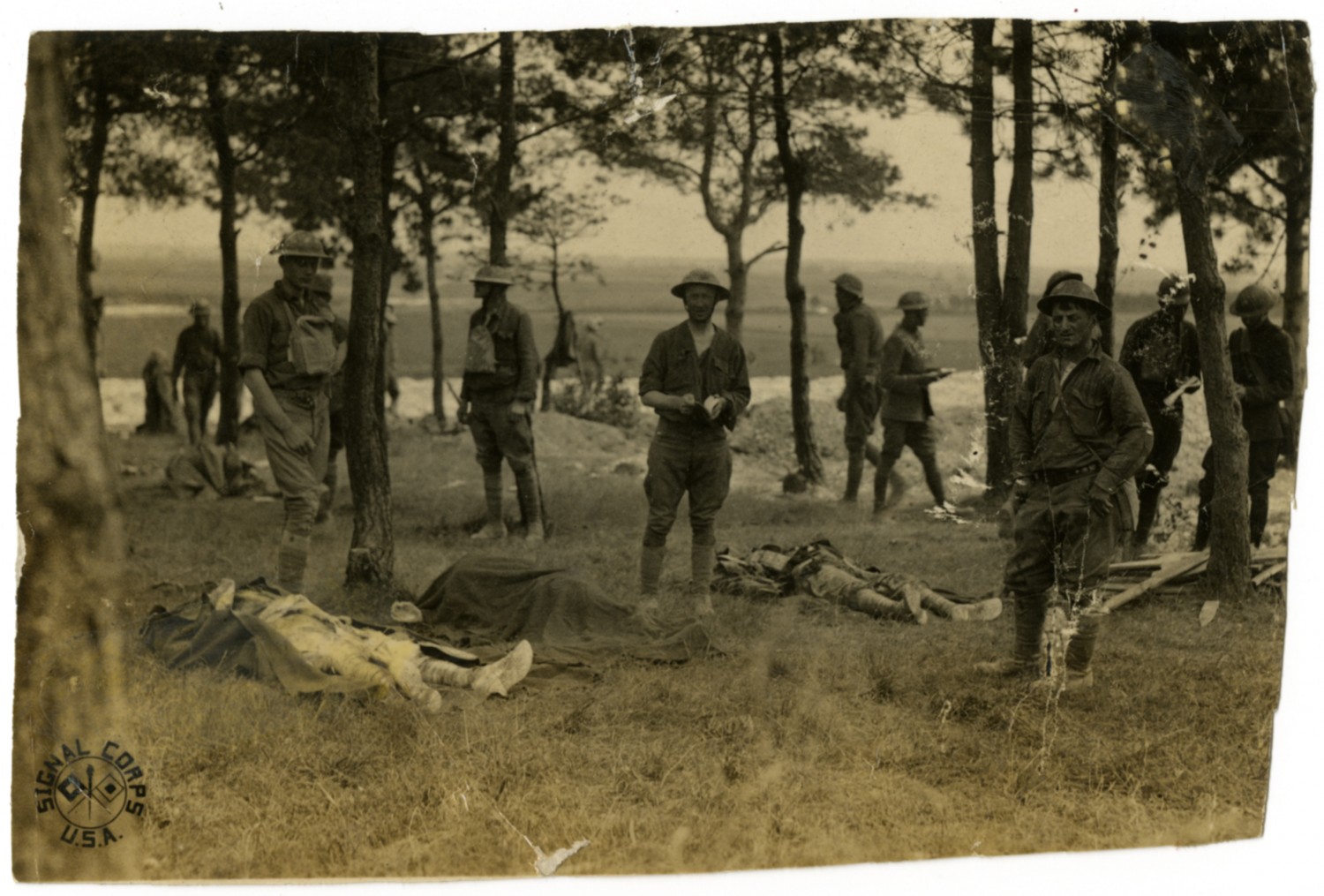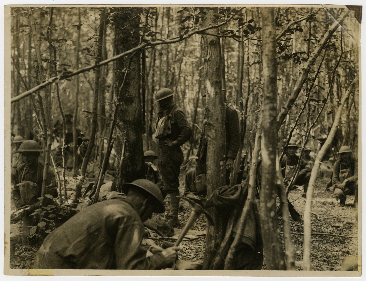 This photograph of American soldiers in a forest is one of several Signal Corps photographs in a collection compiled by Ruby Garrett. Garrett, a Kanas City lawyer, served as Chief Signal Officer of the 117th Field Signal Battalion, 42nd Division, during World War I.