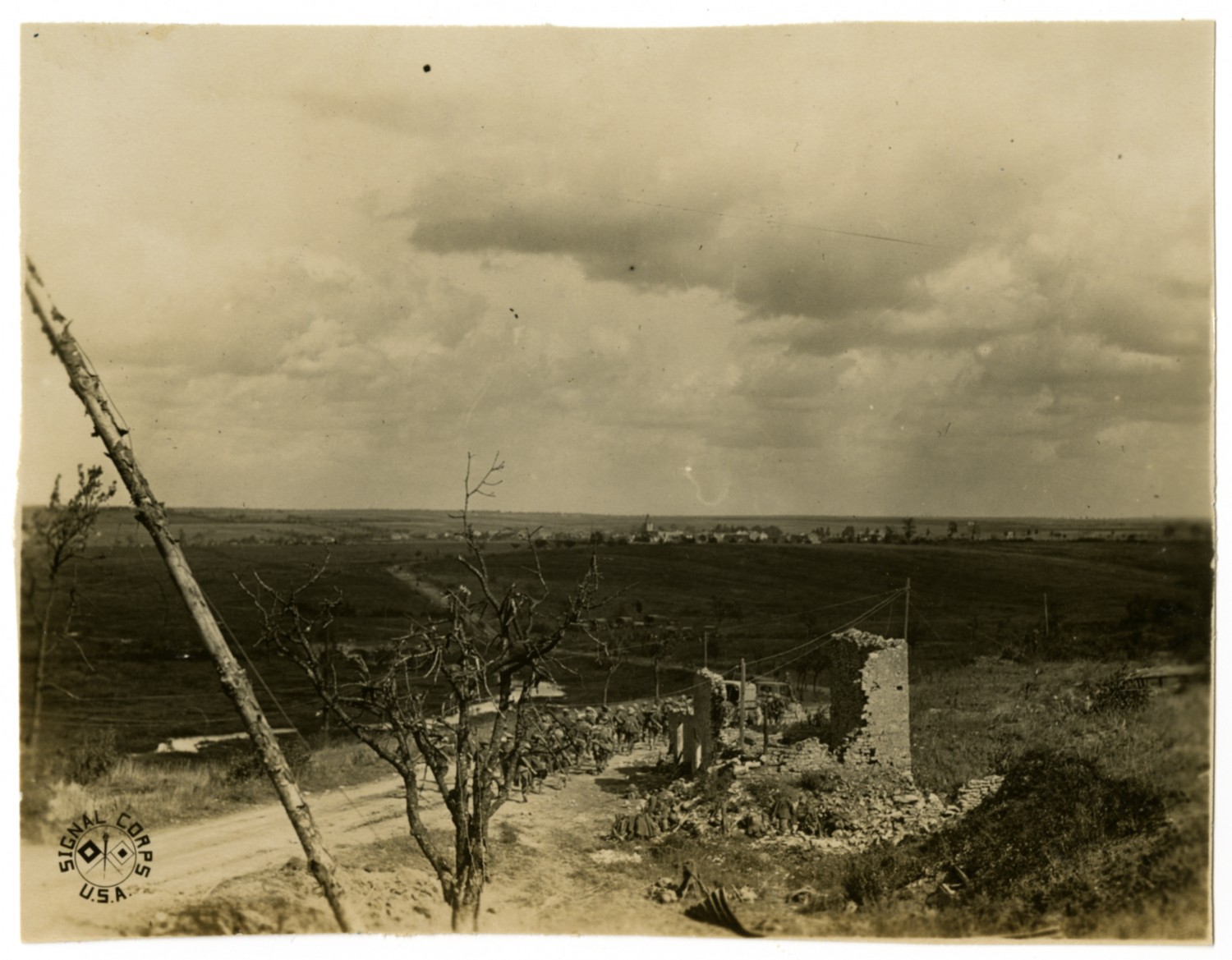 This photograph of soldiers marching past the ruins of a bombarded building is one of several Signal Corps photographs in a collection compiled by Ruby Garrett. Garrett, a Kanas City lawyer, served as Chief Signal Officer of the 117th Field Signal Battalion, 42nd Division, during World War I.
