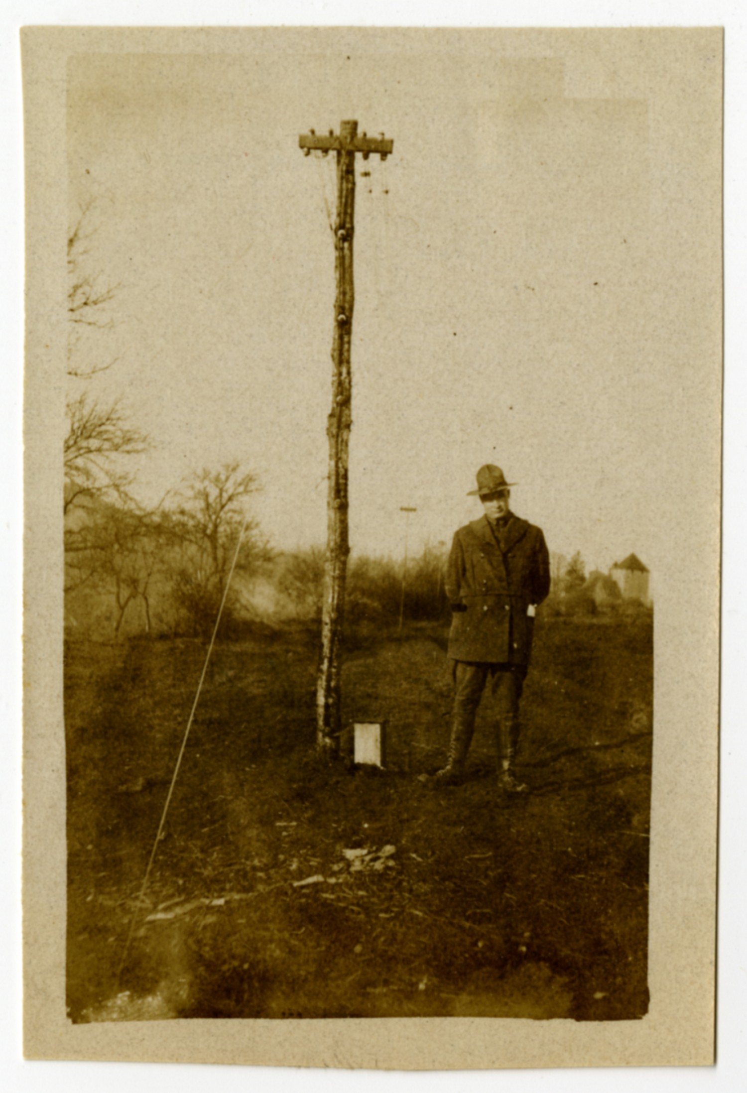 This photograph of soldier in France, standing next to telephone wires, is part of a collection compiled by Ruby D. Garrett, a Kansas City, Missouri lawyer who served as Chief Signal Officer in the 42nd Division during World War I.