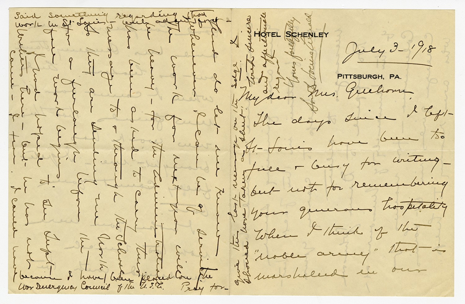 Hotel Schenley July 3-1918 Pittsburgh, [Pennsylvania] My dear Mrs. Gellhorn The days since I left St. Louis have been too full & busy for writing- but not for remembering your generous hospitality. When I think of the