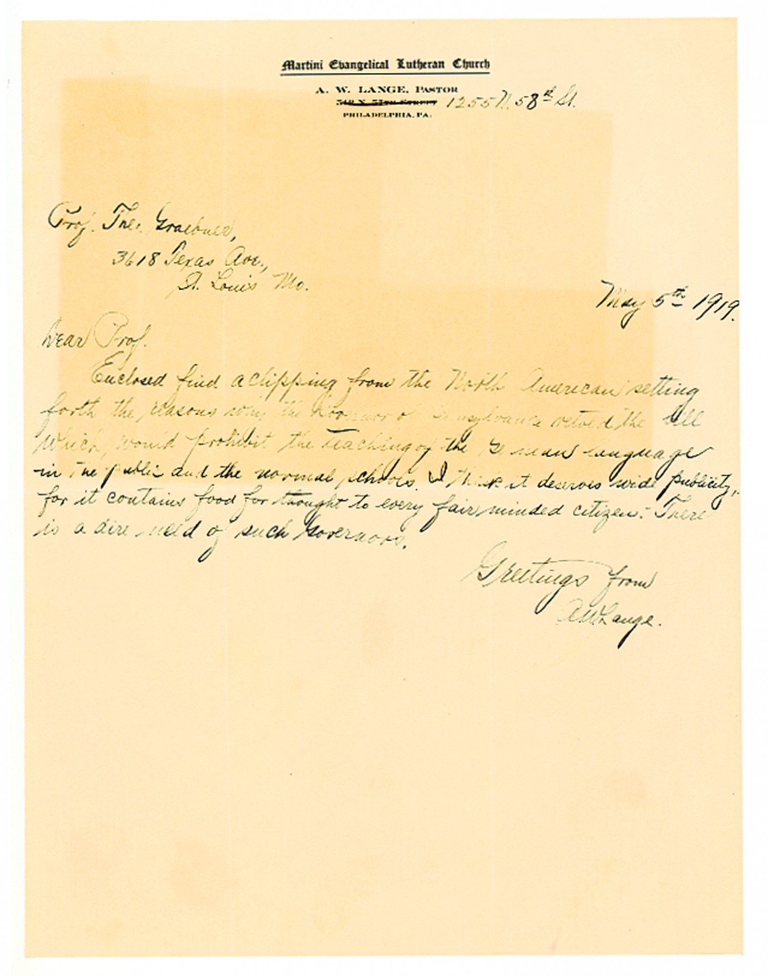 [Martini Evangelical Luther Church letterhead] Prof. Theo Graebner, 3618 Texas Ave., St. Louis [Missouri] May 5th 1919 Dear Prof. Enclosed find a clipping from The North American setting forth the reasons why the Governor of Pennsylvania vetoed the bill which would prohibit the teaching of the German language in the public and the normal schools. I think it deserves wide publicity, for it contains food for thought to every fair minded citizen. There is a dire need of such Governors. Greetings from A.W. Lange