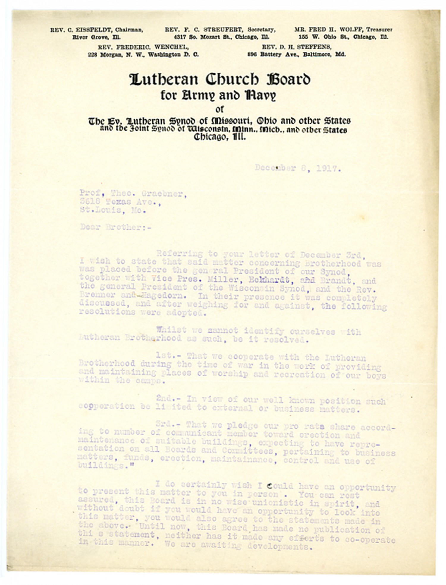 [Lutheran Church Board for Army and Navy Letterhead] December 8, 1917. Prof, Theo. Graebner, 3618 Texas Ave., St. Louis, [Missouri] Dear Brother:- Referring to your letter of December 3rd, I wish to state that said matter concerning Brotherhood was was placed before the general President of the Synod, together with Vice Pres. Miller, Eckhardt, and Brandt, and the general President of the Wisconsin Synod, and the Rev. Brenner and Hagedorn. In their presence it was completely discussed, and after weighing for and against, the following resolutions were adopted. Whilst we cannot identify ourselves with Lutheran Brotherhood as such, be it resolved. 1st.- That we cooperate with the Lutheran Brotherhood ruing the time of was in the work of providing and maintaining places of worship and creation of our boys within the camps. 2nd.- In view of our well known position such cooperation be limited to external or business matters. 3rd.- That we pledge our pro rate share according to number of communicant member toward erection and maintenance of suitable buildings, expecting to have representation on all Boards and Committees, pertaining to business matters, funds, erection, maintainance, control and use of buildings.