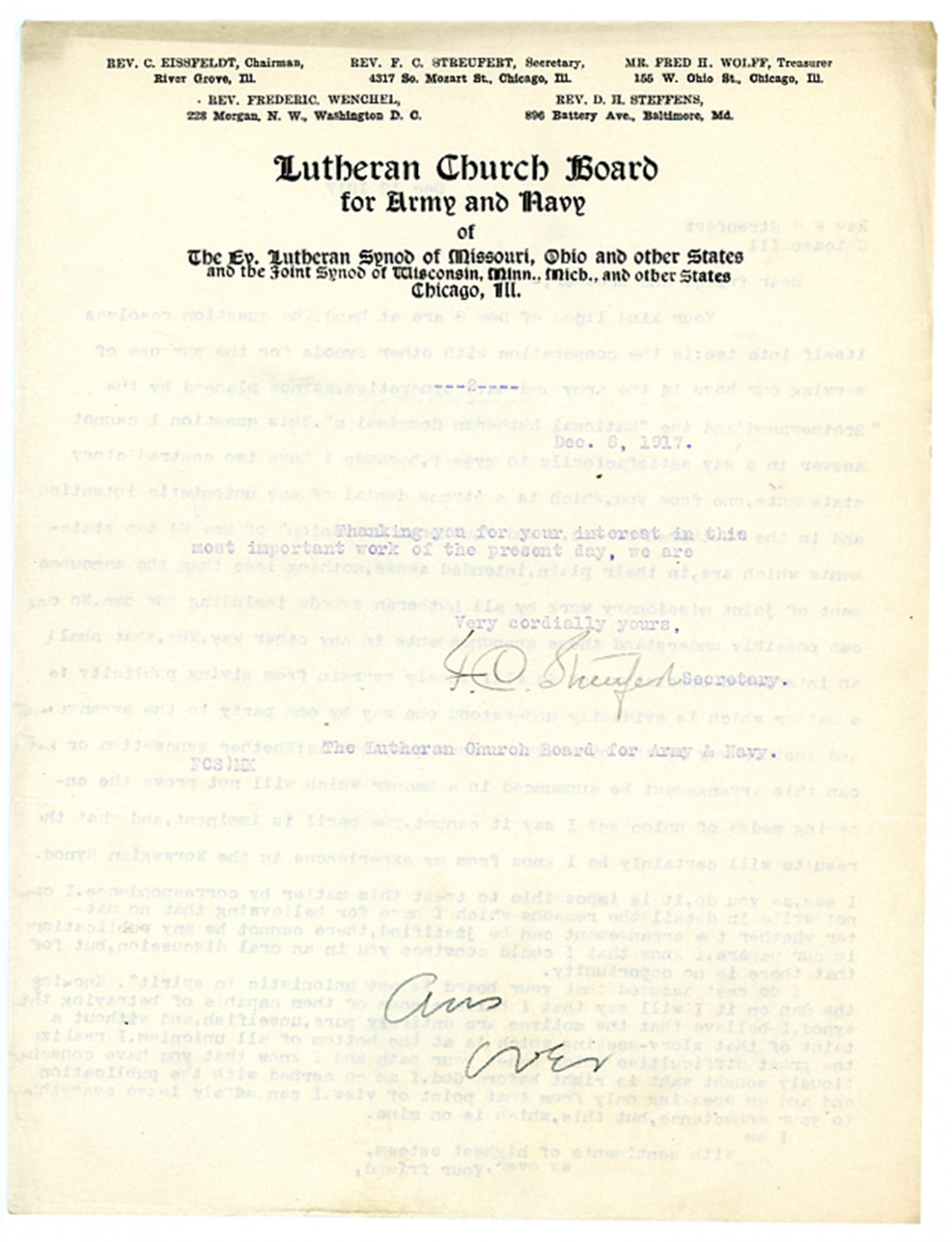 [Lutheran Church Board for Army and Navy Letterhead] [December] 8, 1917. Thanking you for your interest in this most important work of the present day, we are Very cordially yours, F.C. Streufert Secretary. The Lutheran Church Board for Army & Navy. FCS)MK