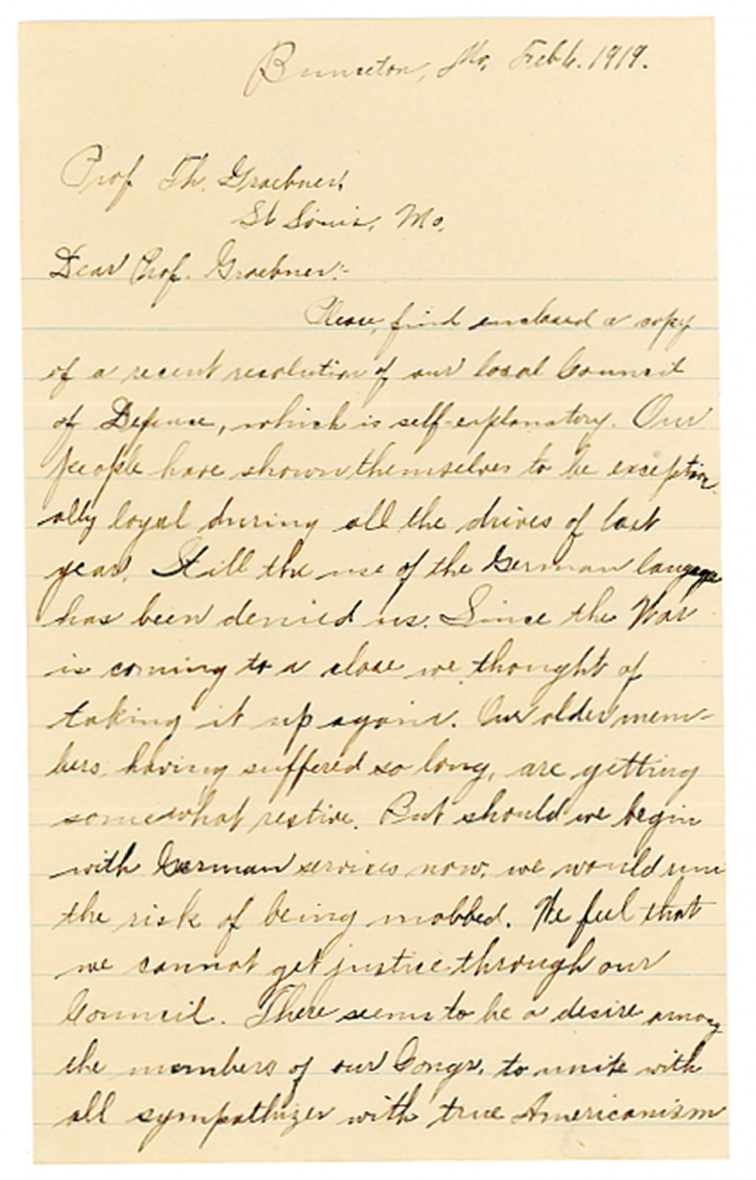 Bunceton, [Missouri February] 6, 1919 Prof Th. Graebner, St. Louis, [Missouri] Dear Prof. Graebner:- Please find enclosed a copy of a recent resolution of our local Council of Defense, which is self-explanatory. Our people have shown themselves to be exceptionally loyal during all the drives of last year. Still the use of the German language has been denied us. Since the War is coming to a close we thought of taking it up again. Our older members having suffered so long, are getting somewhat restive. But should we begin with German services now we would run the risk of being mobbed. We feel that we cannot get justice through our Council. There seems to be a desire among the members of our Congress, to unite with all sympathizers with true Americanism
