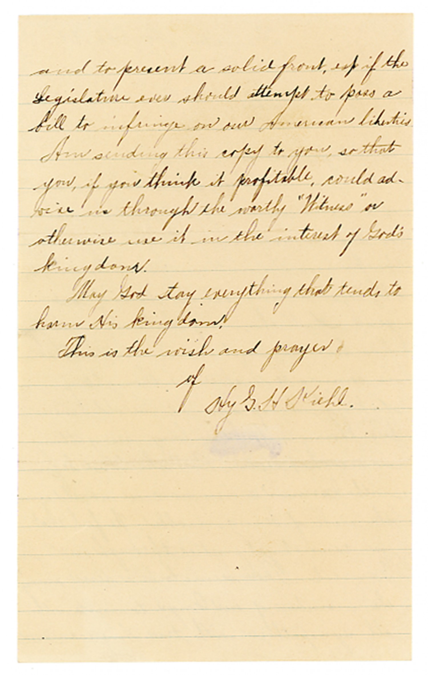 and to present a solid front, esp if the Legislature ever should attempt to pass a bill to infringe on our American liberties. Am sending this copy to you, so that you, if you think it profitable, could advise us through the worthy