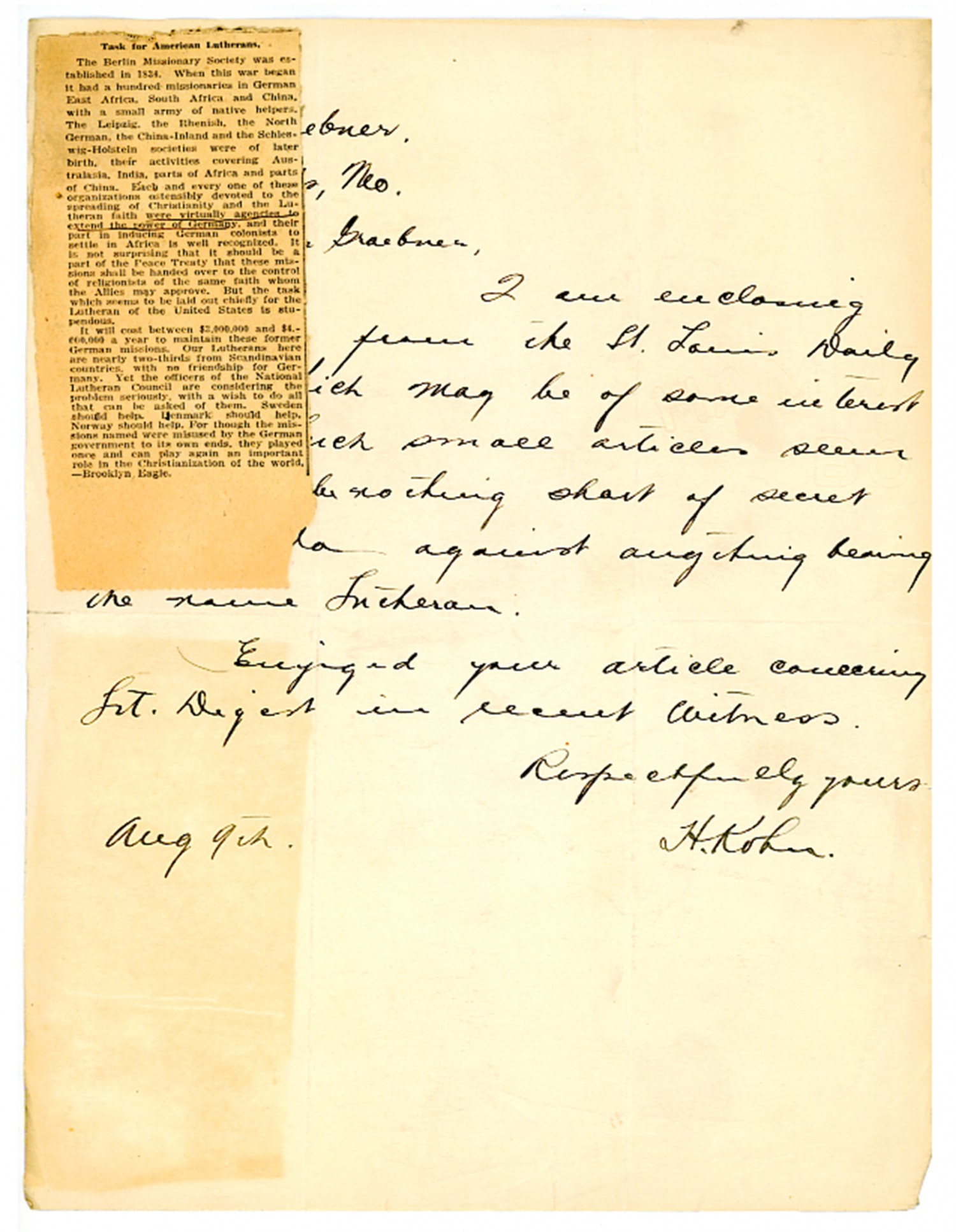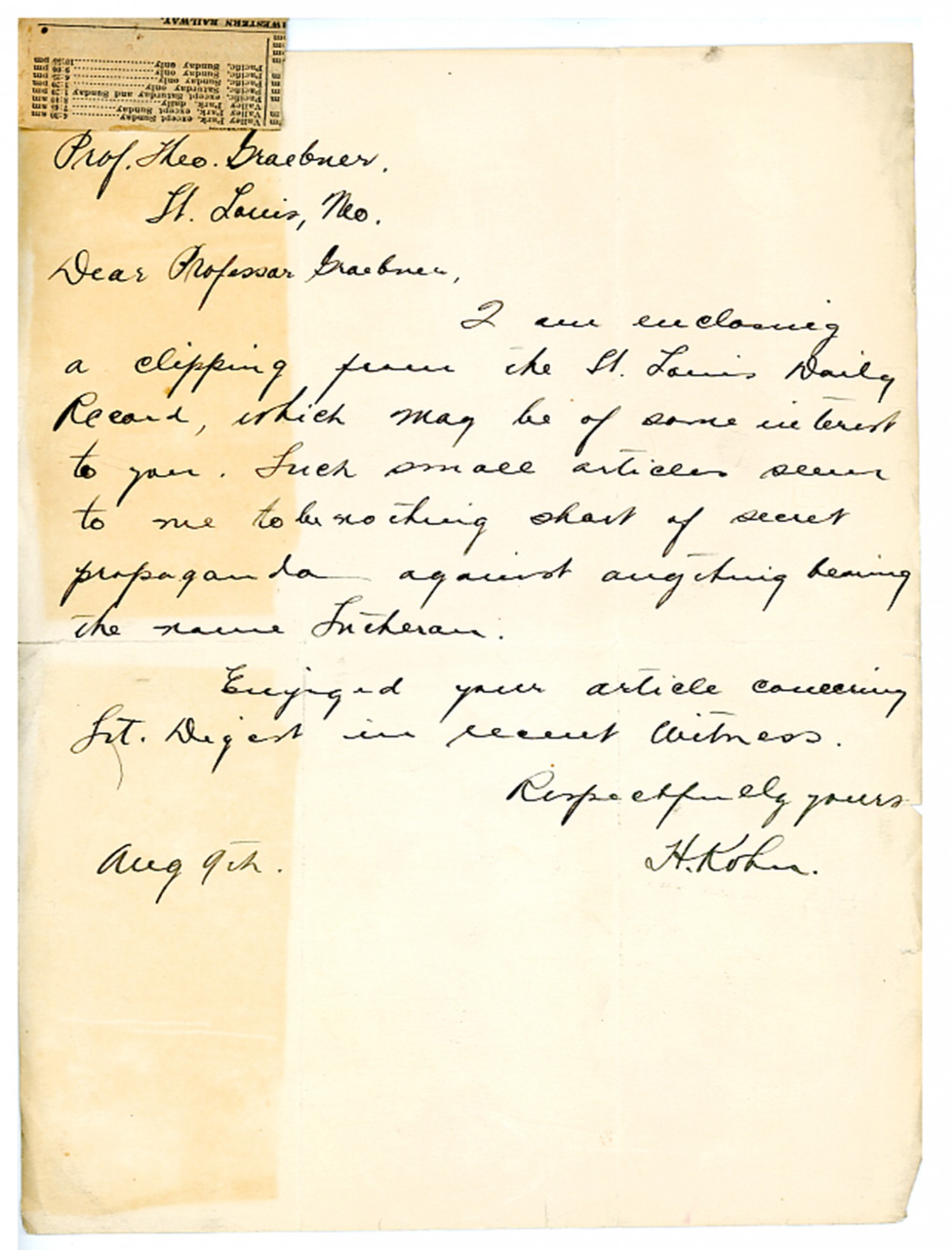 Prof. Theo. Graebner. St. Louis, [Missouri] Dear Professor Graebner, I am enclosing a clipping from the St. Louis Daily Record, which may be of some interest to you. Such small articles seem to me to be nothing short of secret propaganda against anything bearing the name Lutheran. Enjoyed your article concerning Lt. Digert in recent Witness. Respectfully yours [August] 9th H. Kohn.