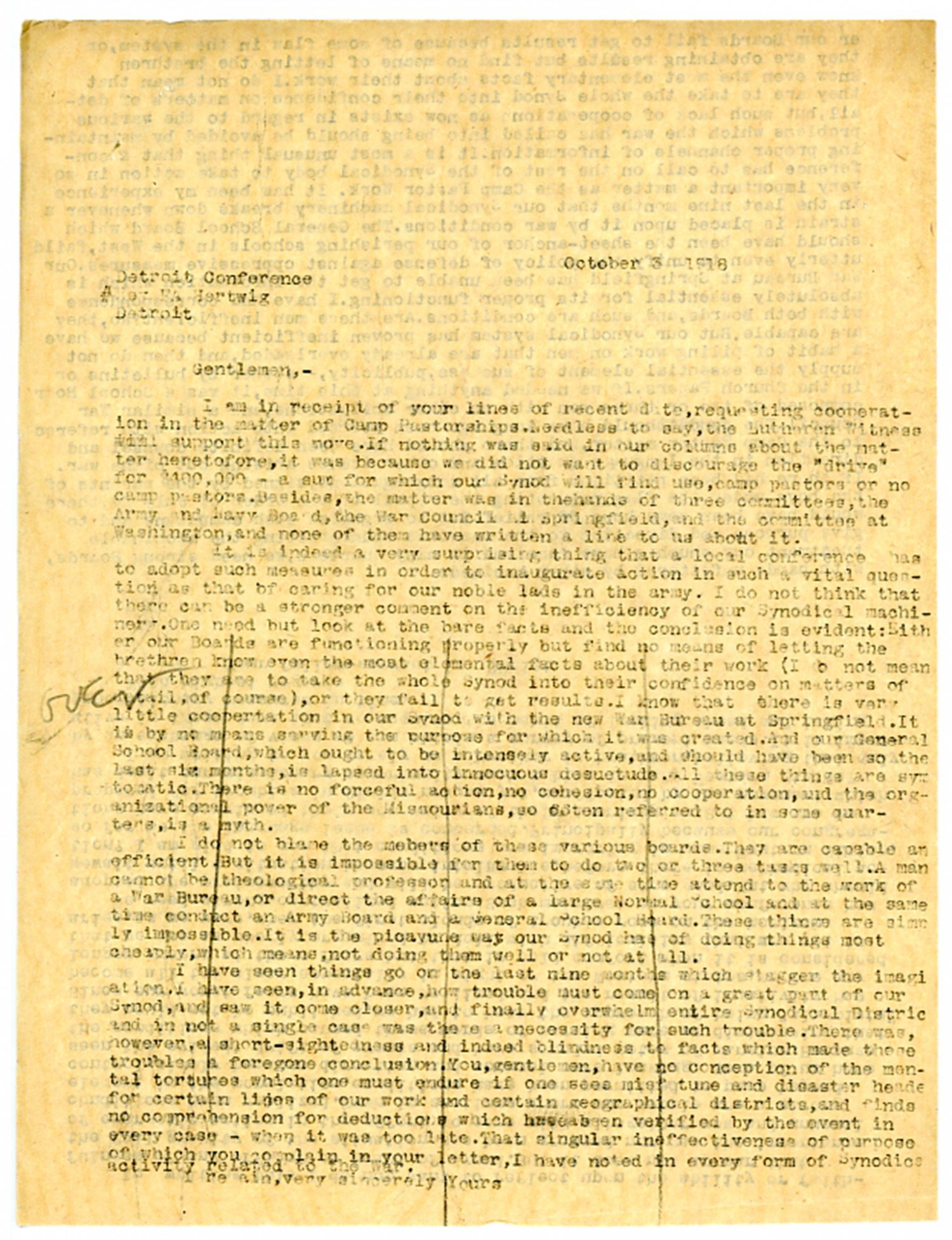 [October] 3, 1918 Detroit Conference [ms illegible: 2 wds] Detroit Gentlemen,- I am in receipt of your lines of recent date, requesting cooperation in the matter of Camp Pastorships. Needless to say, the Lutheran Witness will support this move. If nothing was said in our columns about the matter heretofore, it was because we did not want to discourage the