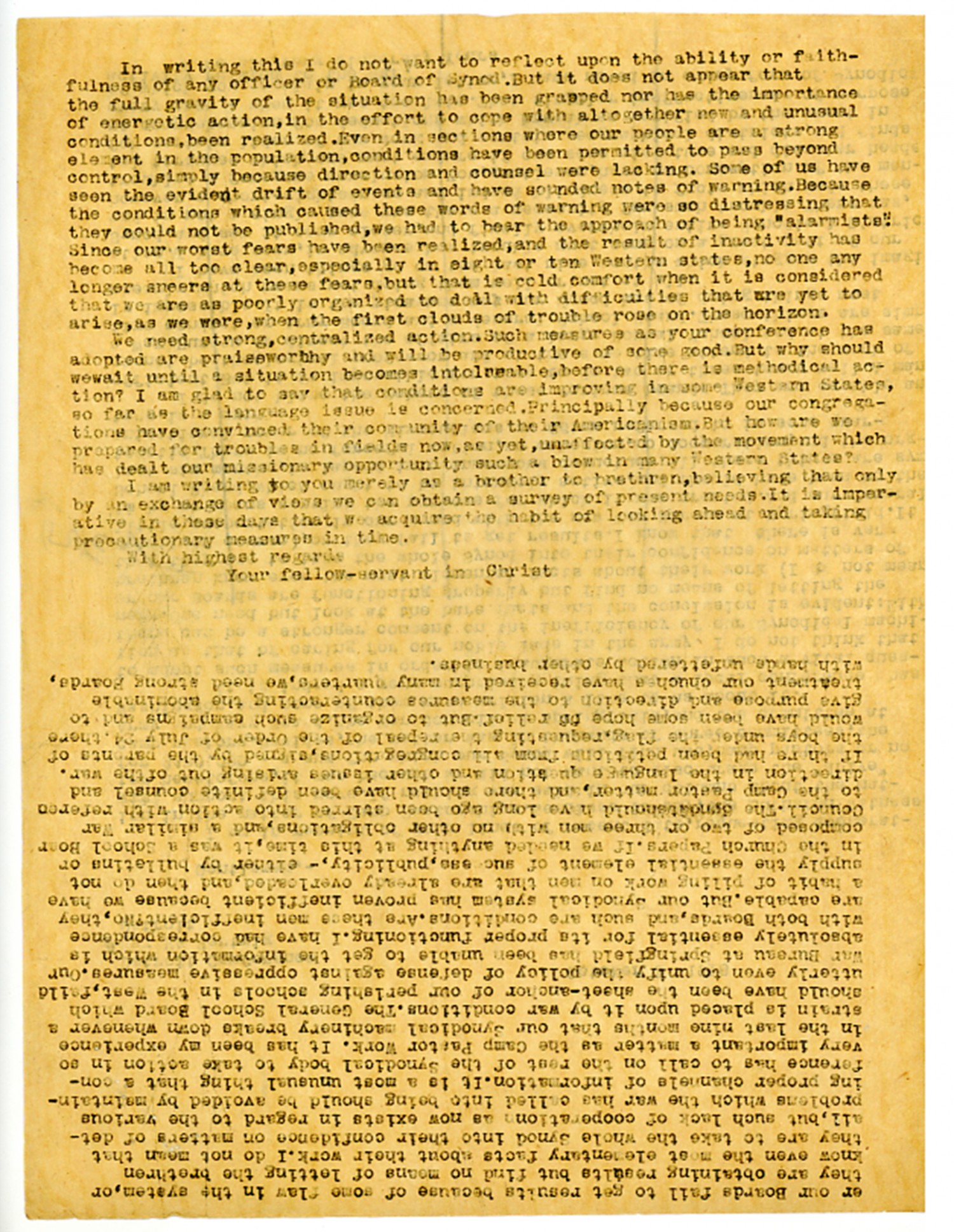 In writing this I do not want to reflect upon the ability or faithfulness of any officer of Board of Synod. But it does not appear that the full gravity of the situation has been grasped nor has the importance of energetic action, in the effort to cope with altogether new and unusual conditions, been realized. Even in sections where our people are a strong element in the population, conditions have been permitted to pass beyond control, simply because direction and counsel were lacking. Some of us have seen the evident drift of events and have sounded notes of warning. Because the conditions which caused these words of warning were so distressing that they could not be published, we had to bear the approach of being