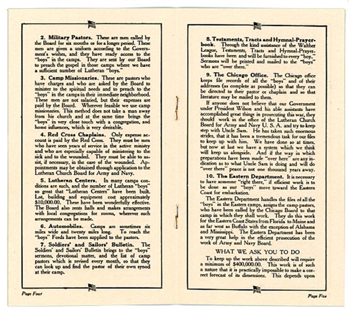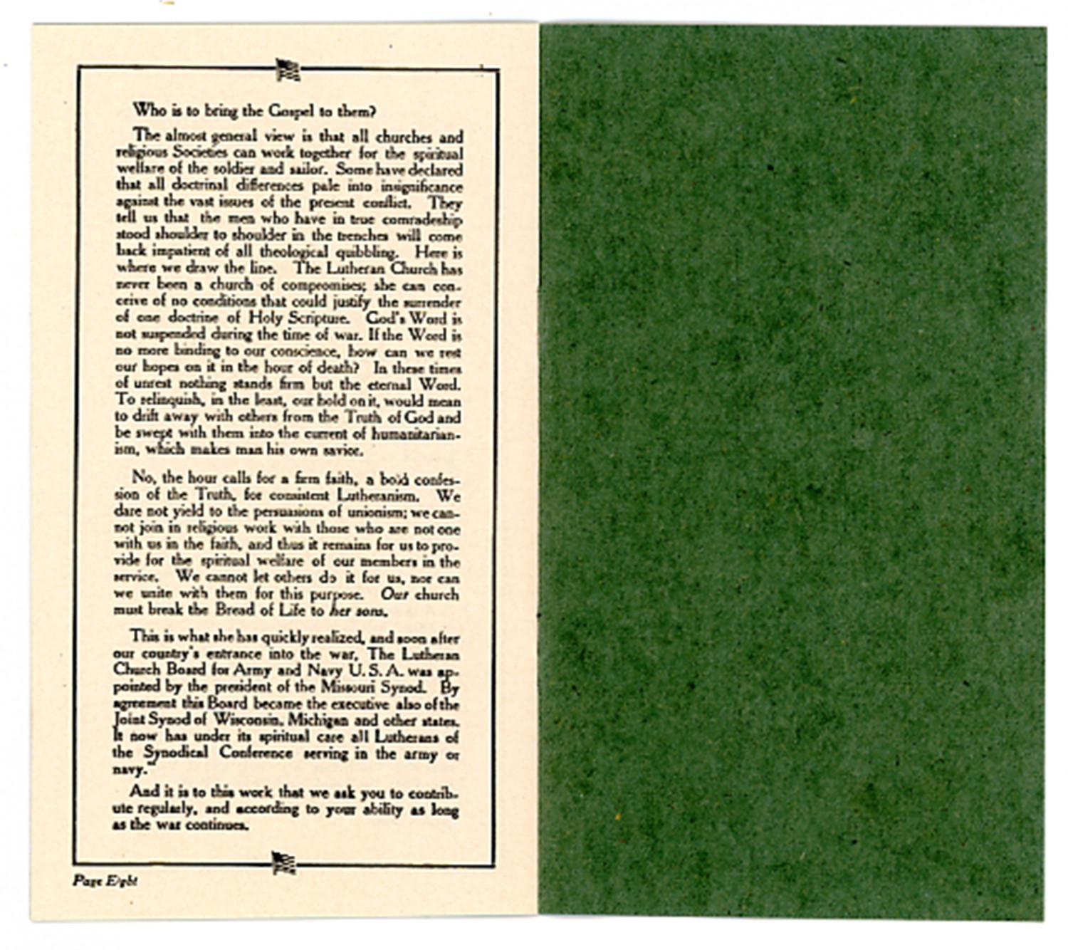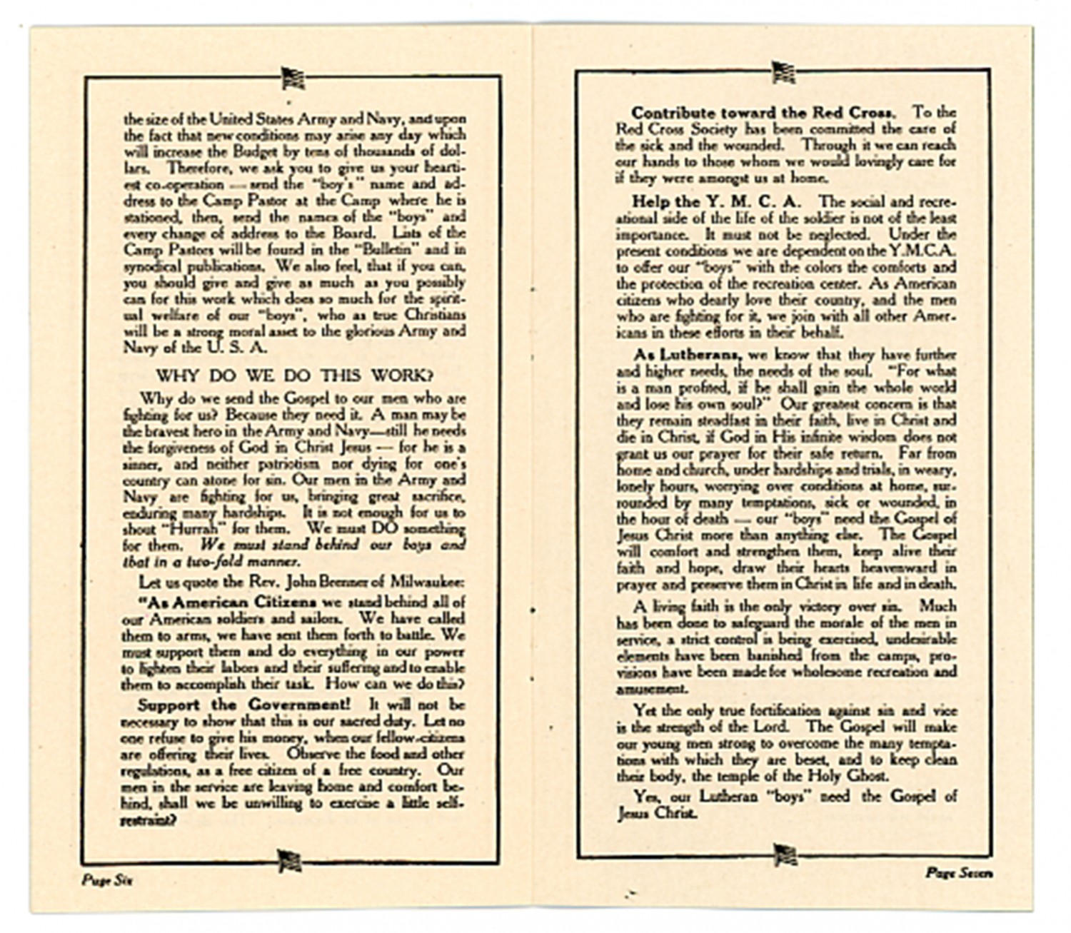 | Description | A pamphlet published by the Lutheran Church Board for Army and Navy to promote the raising of money for the Board. The Board was committed to raising money for camp pastors to be sent to U.S. training camps to help promote the gospel. The Government provide Chaplains, but chaplains could only preach to soldiers within their assigned regiment. Camp pastors were provided to minister at all training camps to men of all religious backgrounds. |