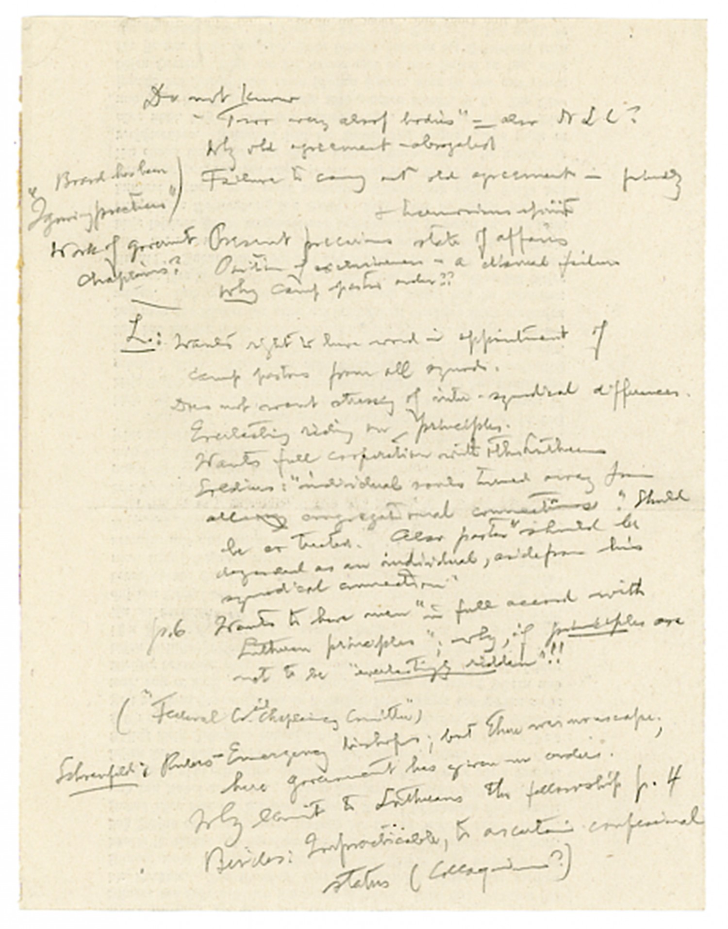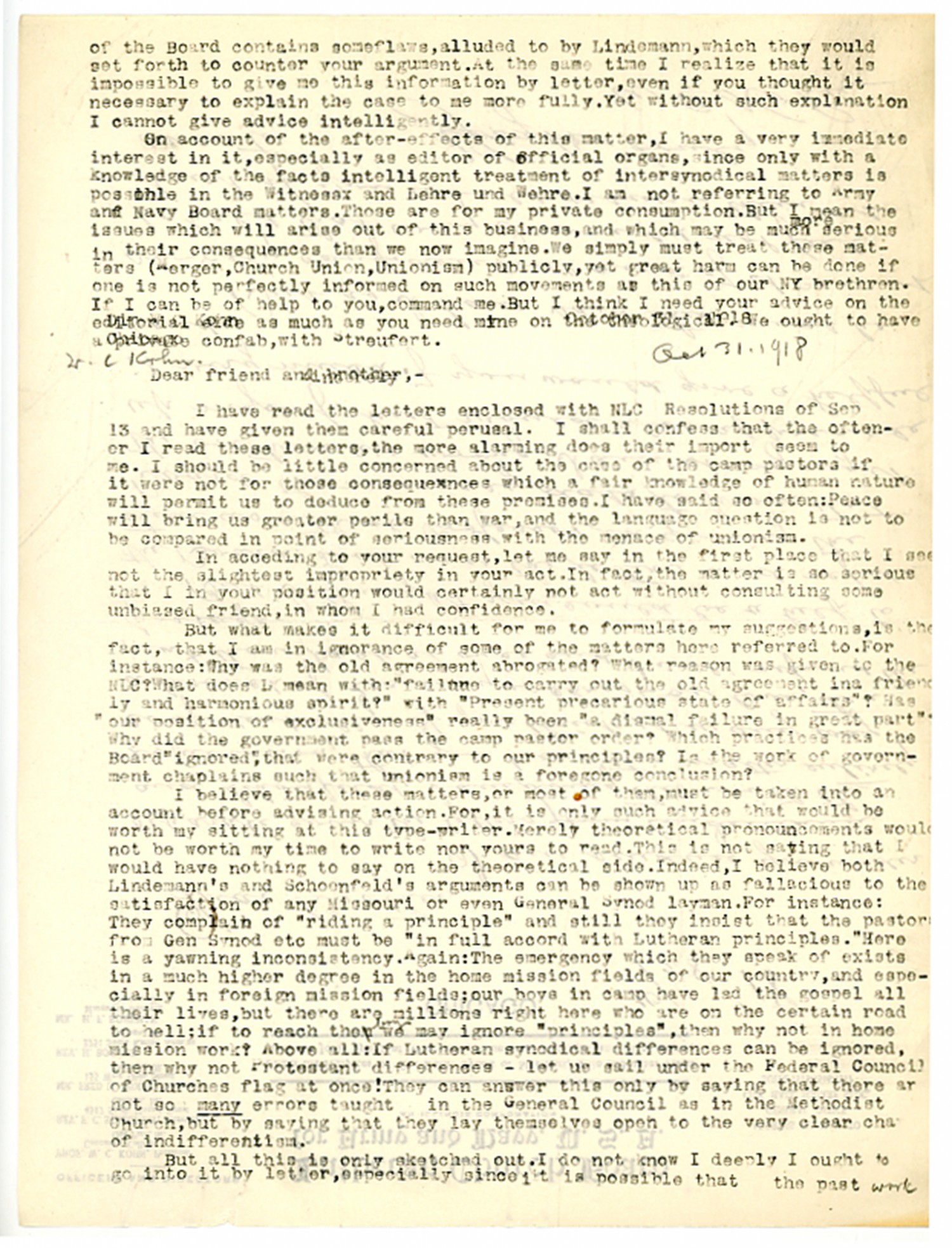 of the Board contains someflaws, alluded to by Lindemann, which they would set forth to counter your argument. At the same time I realize that it is impossible to give me this information by letter, even if you thought it necessary to explain the case to me more fully. Yet without such explination I cannot give advice intelligently. On account of the after-effects of this matter, I have a very immediate interest in it, especially as editor of official organs, since only with a knowledge of the facts intelligent treatment of intersynodical matters is possible in the Witness and Lehre and Wehre. I am not referring to Army and Navy Board matters. Those are for my private consumption. But I mean the issues which will arise out of this business, and which may be much more serious in their consequences than we now imagine. We simply must treat these matters (Merger, Church Union, Unionism) publicly, yet great harm can be done if one is not perfectly informed on such movements as this of our [New York] brethren. If I can be of help to you, command me. But I think I need your advice on the editorial [ms illegible: 1 wd] as much as you need mine on. We ought to have a confab, with Streufert. W.C. Kohn Dear friend and brother, - I have read the letters enclosed with NLC Resolutions of [September] 13 and have given them careful perusal. I shall confess that the oftener I read these letters, the more alarming does their import seem to me. I should be little concerned about the case of the camp pastors if it were not for those consequences which a fair knowledge of human nature will permit us to deduce from these premises. I have said so often: Peace will bring us greater perils than war, and the language question is not to be compared in point of seriousness with the menace of unionism. In acceding to your request, let me say in the first place that I see not the slightest impropriety in your act. In fact, the matter is so serious that I in your position would certainly not act without consulting some unbiased friend, in whom I had confidence. But what makes it difficult for me to formulate my suggestions, is the fact, that I am in ignorance of some of the matters here referred to. For instance: Why was the old agreement abrogated? What reason was given to the NLC? What does L mean with: