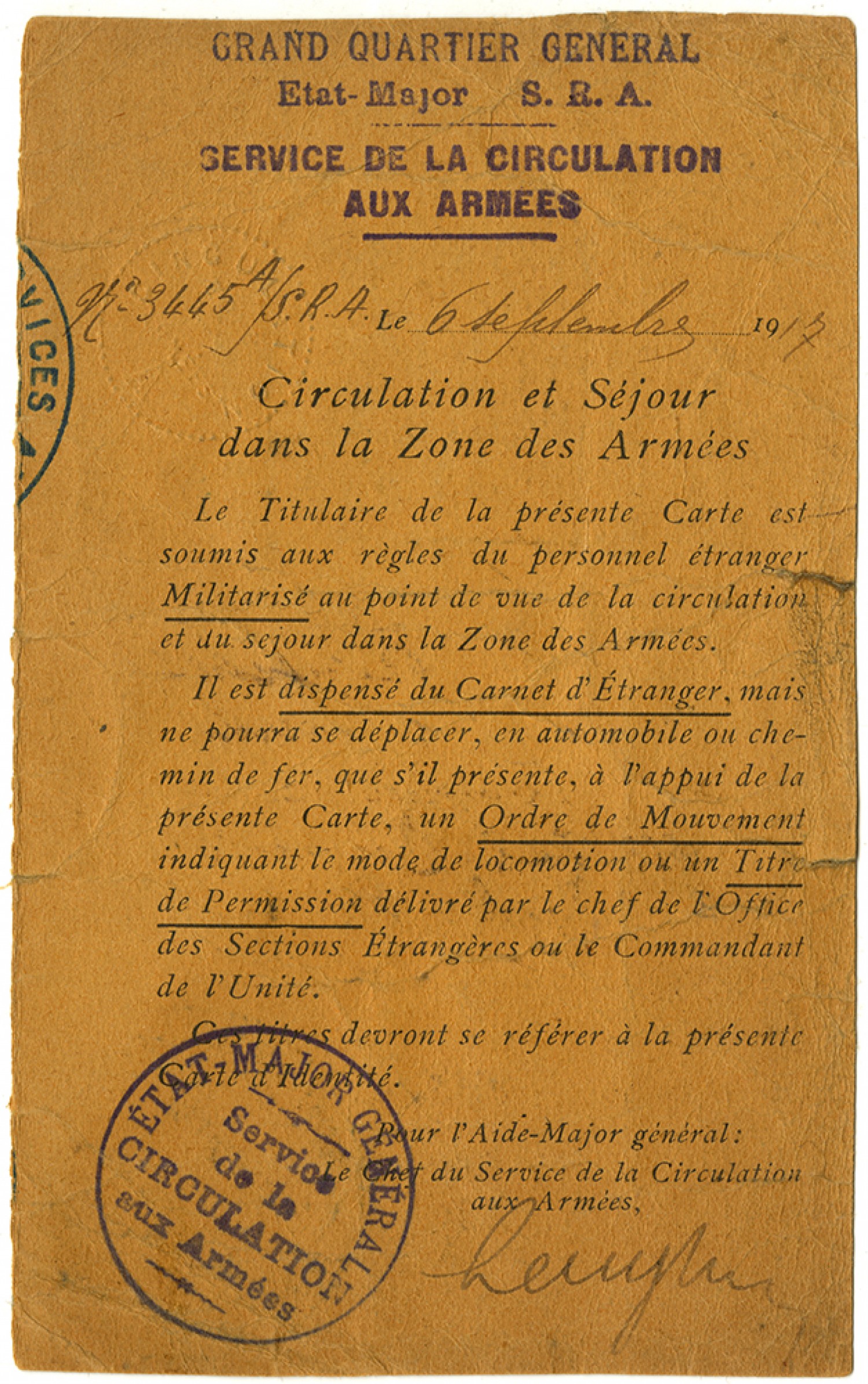 GRAND QUARTIER GENERAL Etat-Major S.R.A. SERVICE DE LA CIRCULATION AUX ARMEES No. 3445 A/S.R.A. Le 6 [September] 1917 Circulation et Sejour dans la Zone des Armees Le Titulaire de lar presente Carte est soumis aux regles dur personnel etranger Militarise au point de vue de la circulation et du sejour dans la Zone des Armees. Il est dispense du Carnet d' Etranger, mais ne pourra se deplacer, en automobile on chemin de fer, que s'il presente, a l'appui de la presente Carte, un Ordre de Mouvement indiquant le mode de locomotion our un Titre de Permission delivre par le chef de l' Office des Sections Etrangeres ou le Commandant de l' Unite. Ces titres devront se referer a la presente Carte d' Identite. Pour l' Aide-Major general: Le Chef du Service de la Circulation aux Armees,
