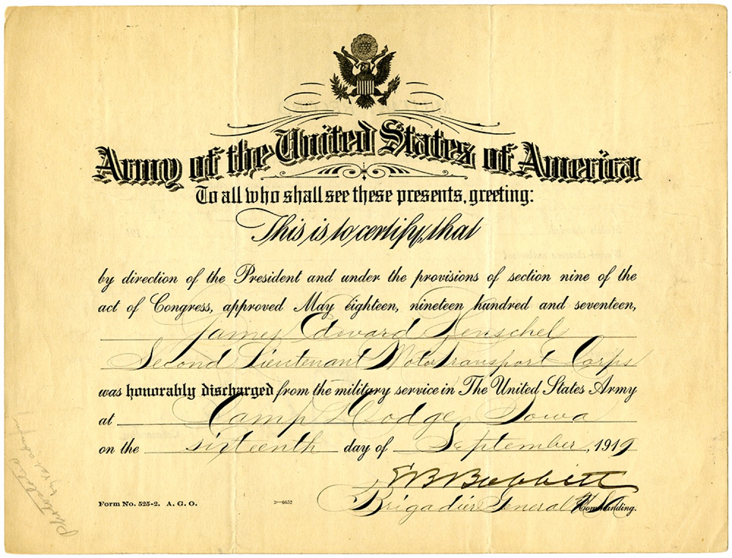 Army of the United States of America To all who shall see these presents, greeting: This is to certify that by direction of the President and under the provisions of section nine of the act of Congress, approved May eighteen, nineteen hundred and seventeen, James Edward Henschel Second Lieutenant Motor Transport Corps was honorably discharged from the military service in The United States Army at Camp Dodge, Iowa on the sixteenth day of September, 1919 EB Babbitt Brigadier General Commanding. Form No. 525-2 A.G.O. 3--6652