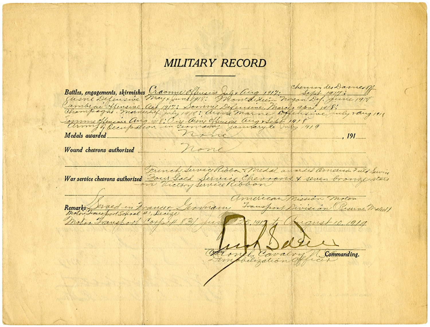 | Subject LCSH | American Field Service; Missouri. National Guard; United States. Army. Motor Transport Corps; Military discharge; Somme, 2nd Battle of the, France, 1918 |