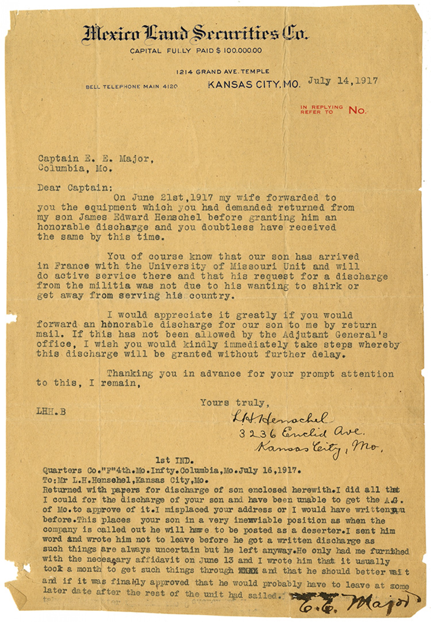 July 14, 1917 Captain E. E. Major, Columbia, [Missouri] Dear Captain: On June 21st, 1917 my wife forwarded to you the equipment which you had demanded returned from my son James Edward Henschel before granting him an honorable discharge and you doubtless have received the same by this time. You of course know that our son has arrived in France with the University of Missouri Unit and will do active service there and that his request for a discharge from the militia was not due to his wanting to shirk or get away from serving his county. I would appreciate it greatly if you would forward an honorable discharge for our son to me by return mail. If this has not been allowed by the Adjutant General's office, I wish you would kindly immediately take steps whereby this discharge will be granted without further delay. Thanking you in advance for your prompt attention to this, I remain, Yours truly, LHH.B L.H. Henschel 3236 Euclid Ave. Kansas City, [Missouri] 1st IND. Quarters Co. "F" 4th [Missouri] Infty. Columbia, [Missour] July 16, 1917. To: Mrs. L.H. Henschel, Kansas City, [Missouri] Returned with papers for discharge of son enclosed herewith. I did all that I could for the discharge of your son and have been unable to get the A.G. of [Missouri] to approve of it. I misplaced your address or I would have written you before. This places your son in a very inenviable position as when the company is called out he will have to be posted as a deserter. I sent him word and wrote him not to leave before he got a written discharge as such things are always uncertain but he left anyway. He only had me furnished with the necessary affidavit on June 13 and I wrote him that it usually took a month to get such things through and that he should better wait and if it was finally approved that he would probably have to leave at some later date after the rest of the unit had sailed. E.E. Major