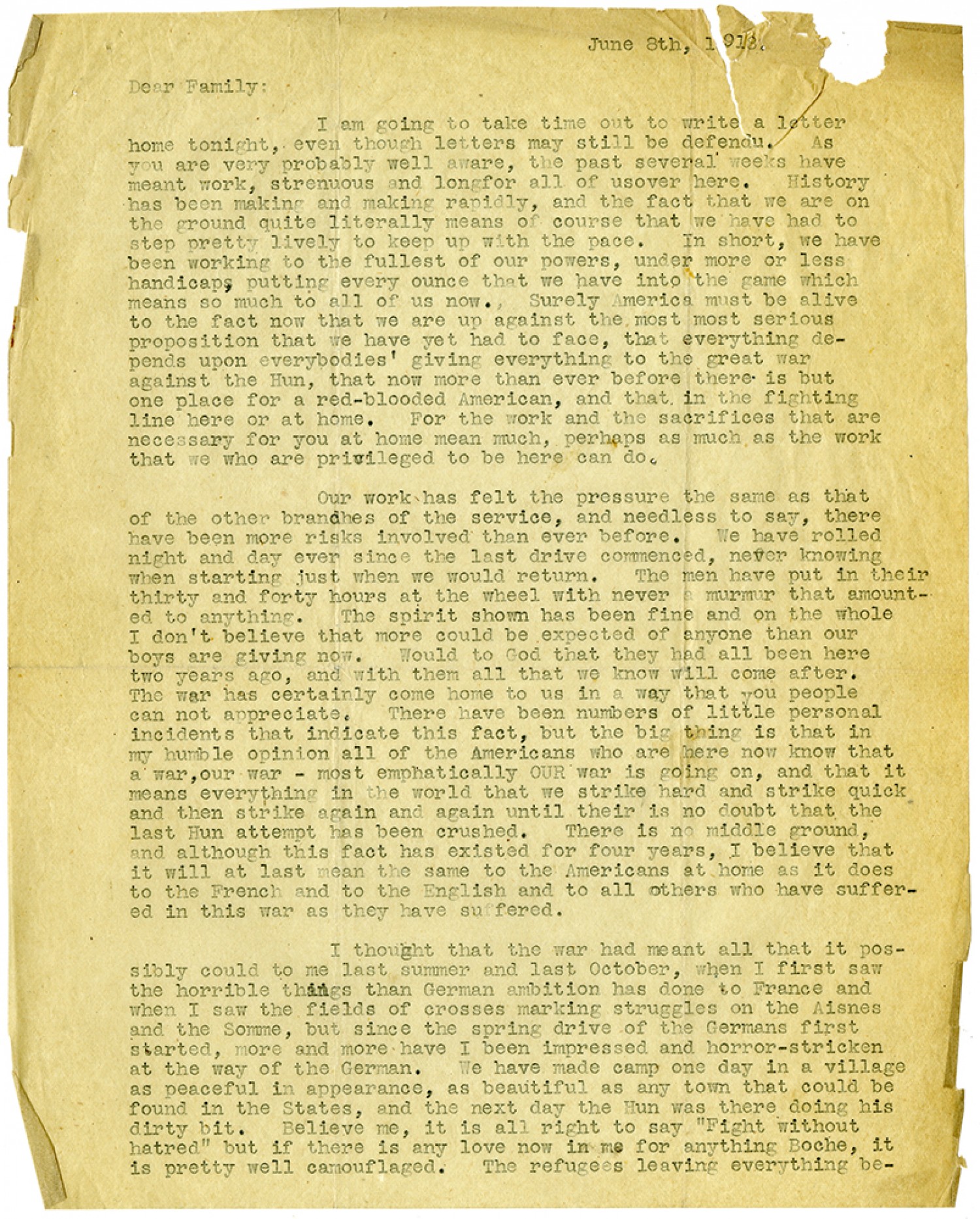 June 8, 1918. Dear Family: I am going to take time out to write a letter home tonight, even though letters may still be defendu. As you are very probably well aware, the past several weeks have meant work, strenuous and long for all of us over here. History has been making and making rapidly, and the fact that we are on the ground quite literally means of course that we have had to step pretty lively to keep up with the pace. In short, we have been working to the fullest of our powers, under more or less handicaps, putting every ounce that we have into the game which means so much to all of us now. Surely America must be alive to the fact now that we are up against the most most serious proposition that we have yet had to face, that everything depends up on everybodies' giving everything to the great war against the Hun, that now more than ever before there is but one place for a red-blooded American, and that in the fighting line here or at home. For the work and the sacrifices that are necessary for you at home mean much, perhaps as much as the work that we who are privileged to be here can do. Our work has felt the pressure the same as that of the other branches of the service, and needless to say, there have been more risks involved than ever before. We have rolled night and day ever since the last drive commenced, never knowing when starting just when we would return. The men have put in their thirty and forty hours at the wheel with never a murmur that amounted to anything. The spirit shown has been fine and on the whole I don't believe that more could be expected of anyone than our boys are giving now. Would to God that they had all been here two years ago, and with them all that we know will come after. The war has certainly come home to us in a way that you people can not appreciate. There have been numbers of little personal incidents that indicate this fact, but the big thing is that in my humble opinion all of the Americans who are here now know that a war, our war - most emphatically OUR war is going on, and that it means everything in the world that we strike hard and strike quick and then strike again and again until their is no doubt that the last Hun attempt has been crushed. There is no middle ground, and although this fact has excited for four years, I believe that it will at last mean the same to the Americans at home as it does to the French and to the English and to all others who have suffered in this war as they have suffered. I thought that the war had meant all that it possibly could to me last summer and last October, when I first saw the horrible things than German ambition has done to France and when I saw the fields of crosses marking struggles on the Aisnes and the Somme, but since the spring drive of the Germans first started, more and more have I been impressed and horror-stricken at the way of the German. We have made camp one day in a village as peaceful in appearance, as beautiful as any town that could be found in the States, and the next day the Hun was there doing his dirty bit. Believe me, it is all right to say "Fight without hatred" but if there is any love now in me for anything Boche, it is pretty well camouflaged. The refugees leaving everything be-